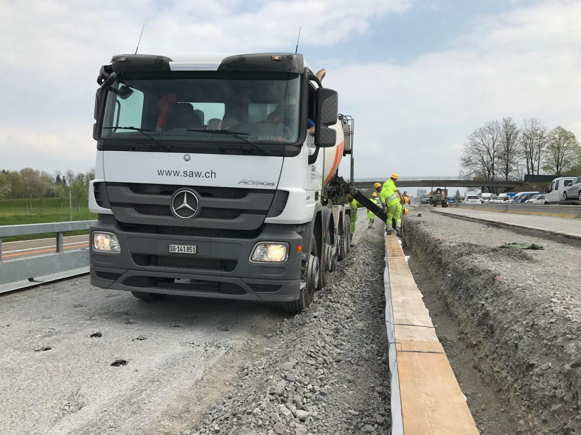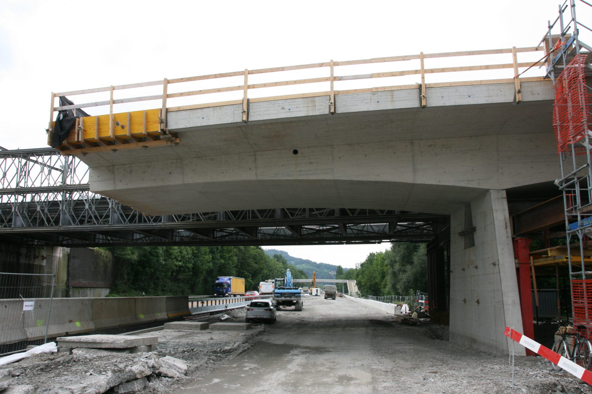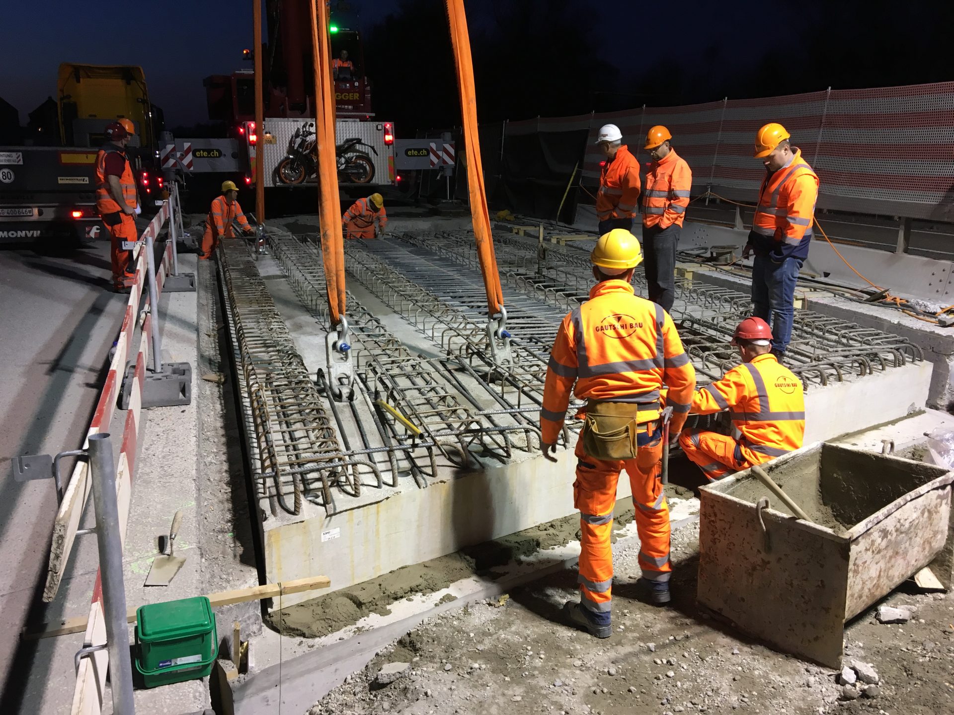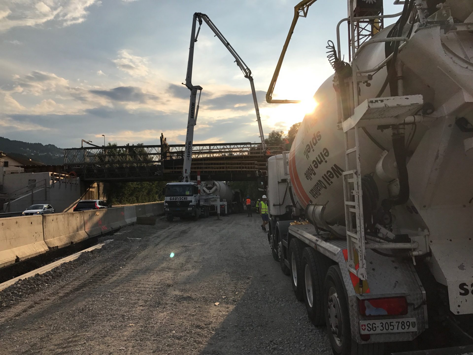 Das Autobahnstück zwischen Rheineck und St. Margrethen welches sich auf 7,3 km erstreckt wurde nach fast 40 jährigem Bestehen grundsaniert. Diverse Brückenquerungen, Werkleitungen und Fahrbahnsanierungen sowie die Erstellung einer Lärmschutzwand waren nur ein Teil der grossen Sanierung. Von der ARGE Rheintal wurden wir mit der Lieferung von Brückenelementen sowie den Transportbetonlieferungen beauftragt. Highlight der Baustelle war dabei die neue Zollbrücke welche mit 660m3 Betoniervolumen in einem Guss erstellt wurde. Extreme Anforderungen an die Betonqualität, erschwerte Zu- und Wegfahrtsbedingungen sowie Wochenend- und Nachteinsätze haben flexible Maschinen und motiviertes Personal gefordert.