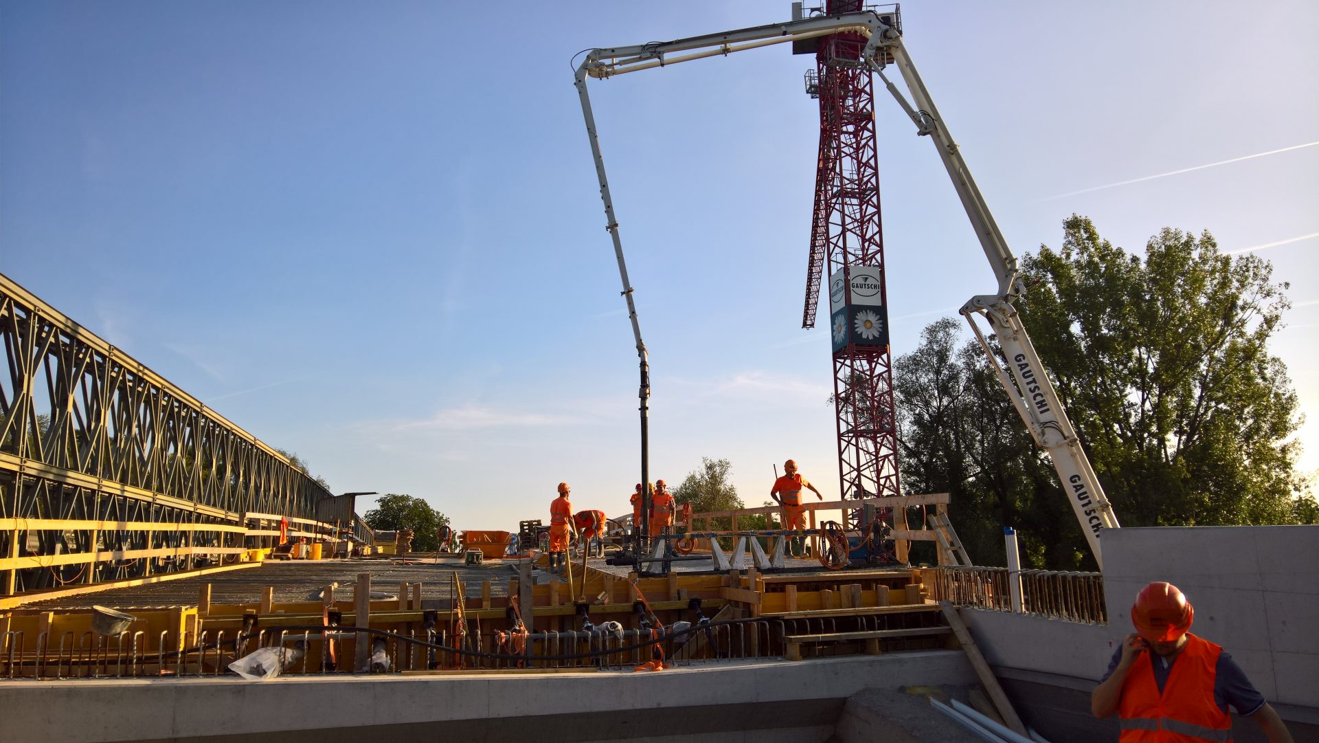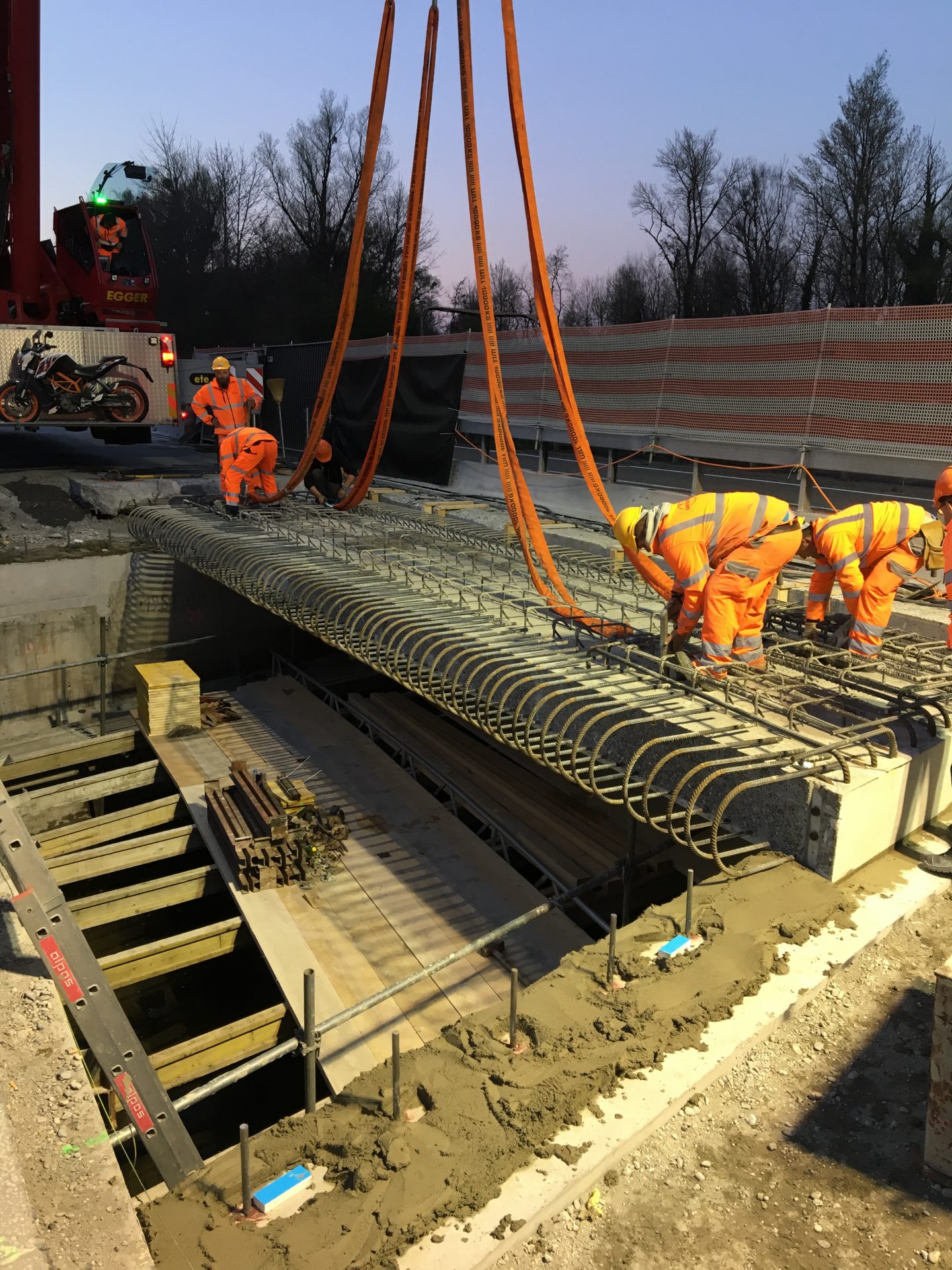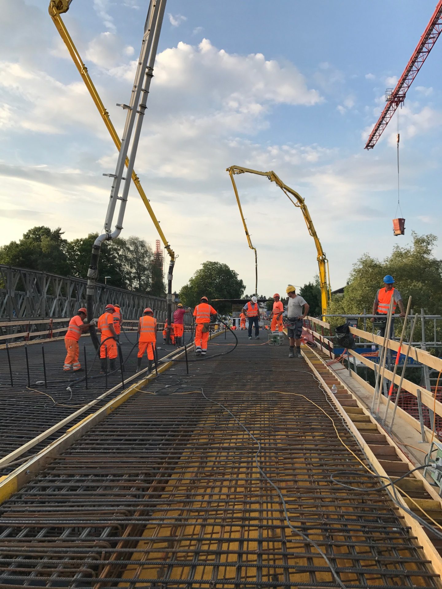 Das Autobahnstück zwischen Rheineck und St. Margrethen welches sich auf 7,3 km erstreckt wurde nach fast 40 jährigem Bestehen grundsaniert. Diverse Brückenquerungen, Werkleitungen und Fahrbahnsanierungen sowie die Erstellung einer Lärmschutzwand waren nur ein Teil der grossen Sanierung. Von der ARGE Rheintal wurden wir mit der Lieferung von Brückenelementen sowie den Transportbetonlieferungen beauftragt. Highlight der Baustelle war dabei die neue Zollbrücke welche mit 660m3 Betoniervolumen in einem Guss erstellt wurde. Extreme Anforderungen an die Betonqualität, erschwerte Zu- und Wegfahrtsbedingungen sowie Wochenend- und Nachteinsätze haben flexible Maschinen und motiviertes Personal gefordert.