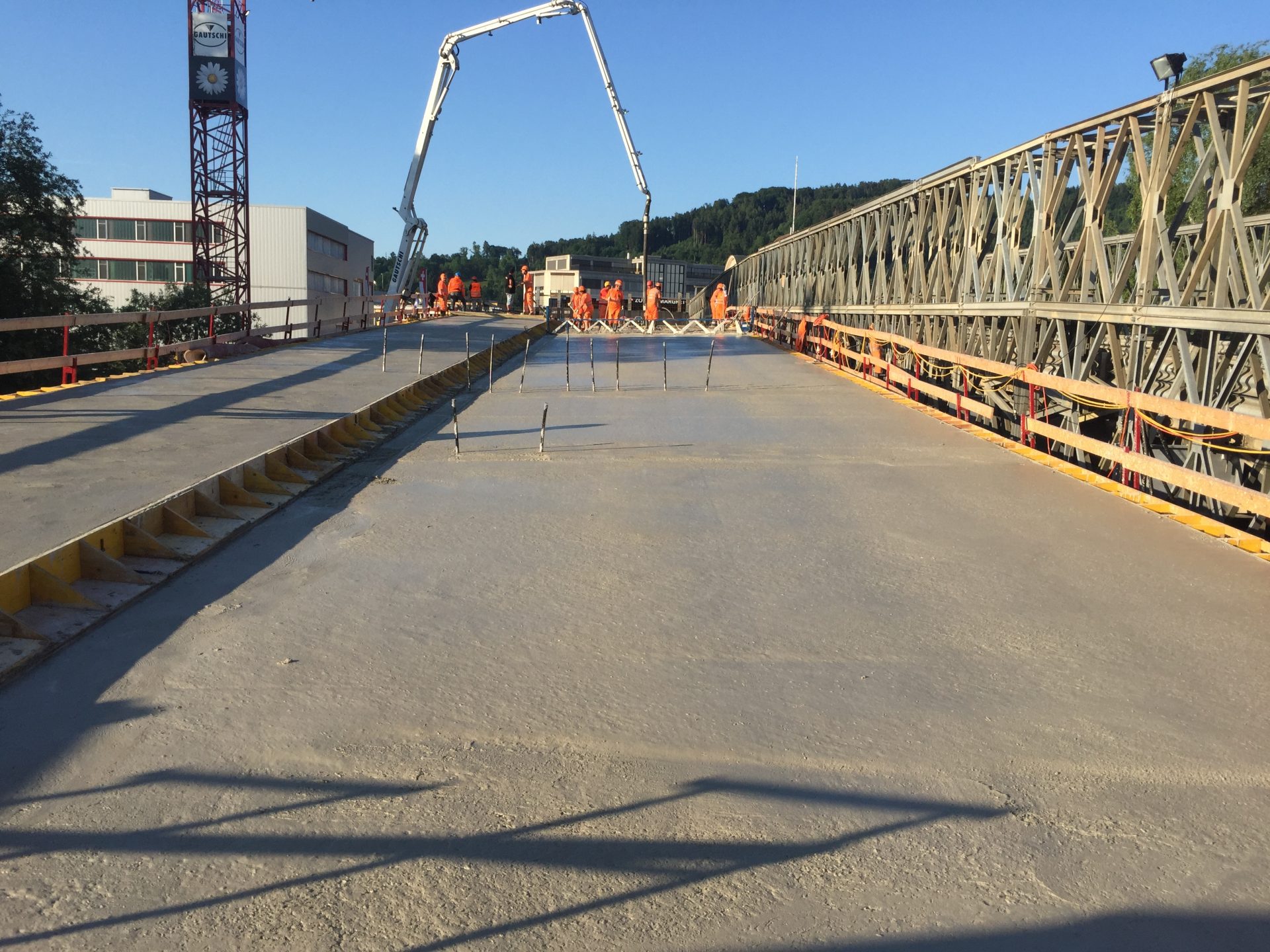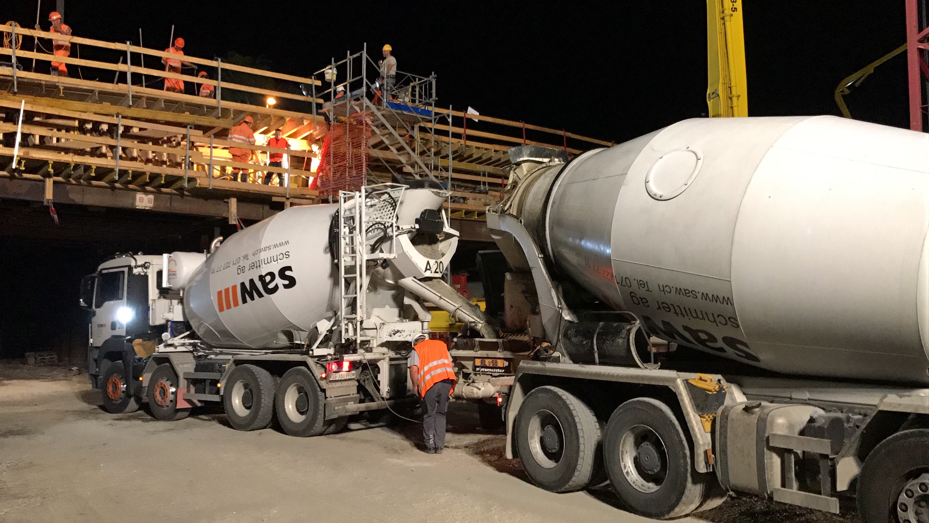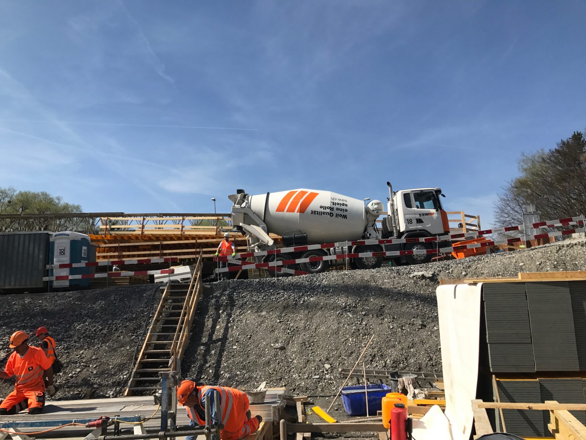 Hinzu kamen diverse Anforderungen an die Betonsorten. Vom schnellhärtenden Beton, welcher mit Beschleuniger innert weniger Stunden erhärtete, über Luftporenbeton mit Sichtanforderungen, bis zum speziellen Fahrbahnbeton, welcher mit einem Schwindmass von 3‰ sowie Zuschlagsstoffen mit PSV 50 erstellt werden musste, war das Leistungspektrum sehr gross.