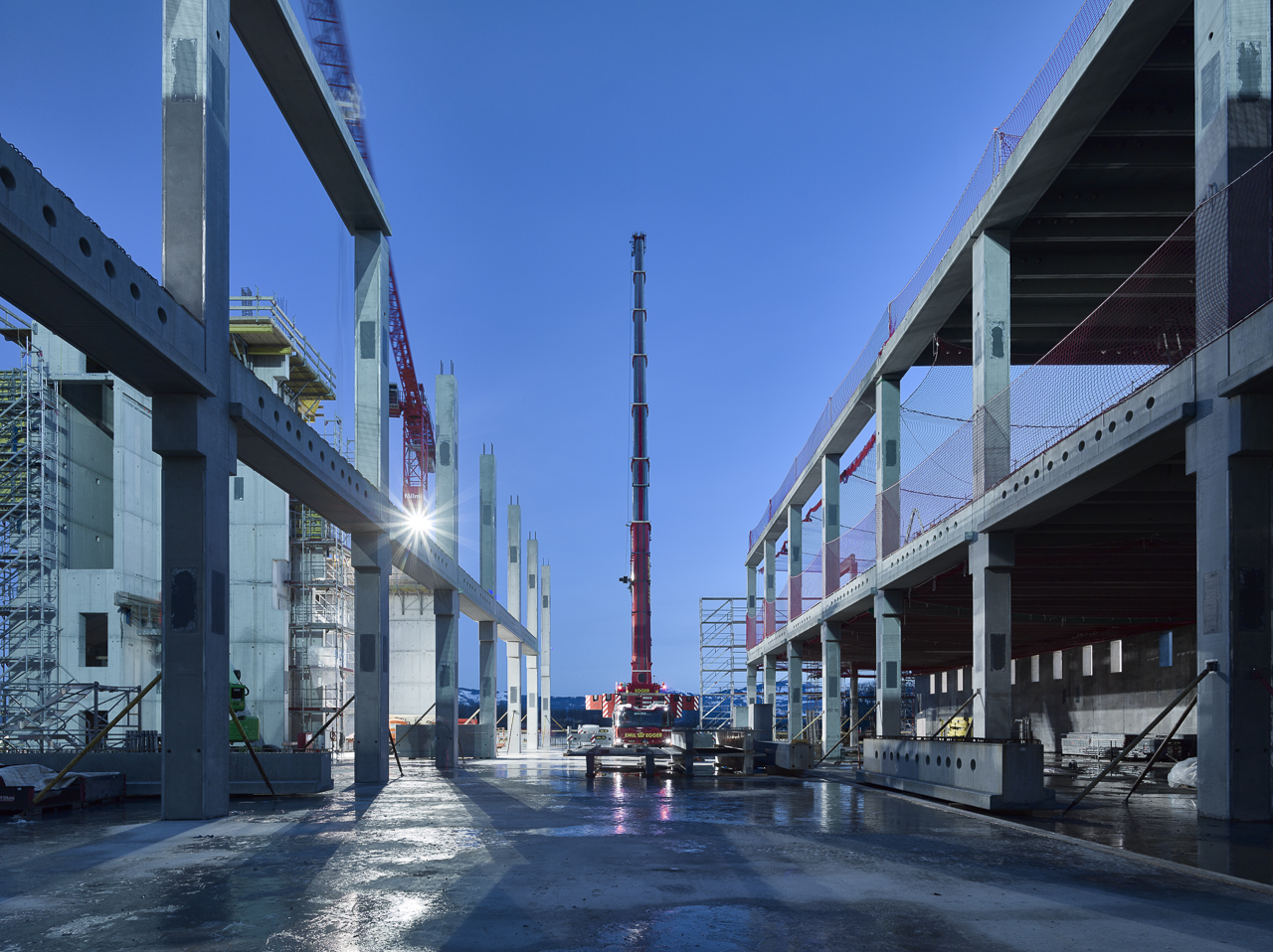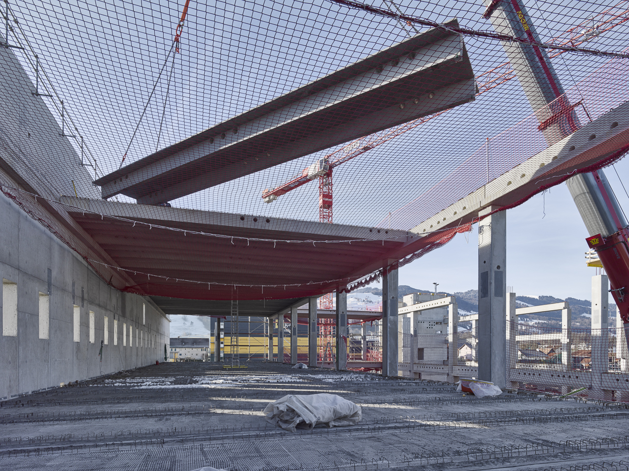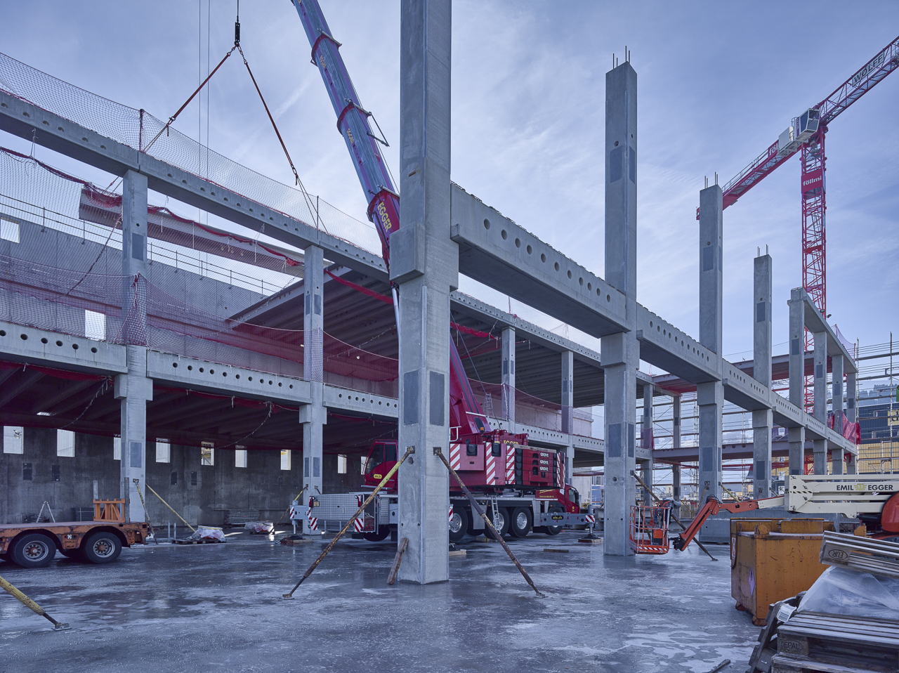 Unser Unternehmen durfte hier rund 400 Betonelemente für die Tragkonstruktion des Baus liefern. Darunter Stützen, Träger und Rippenplatten mit zertifiziertem brandbeständigen Beton hergestellt.