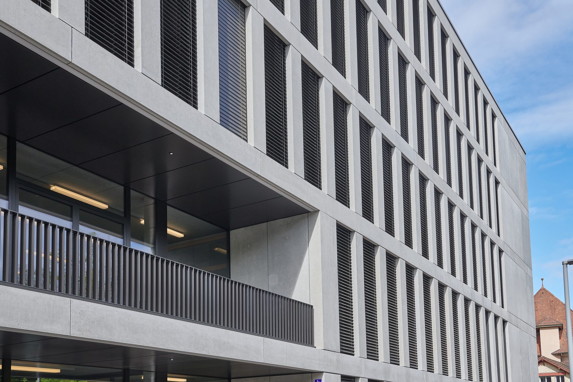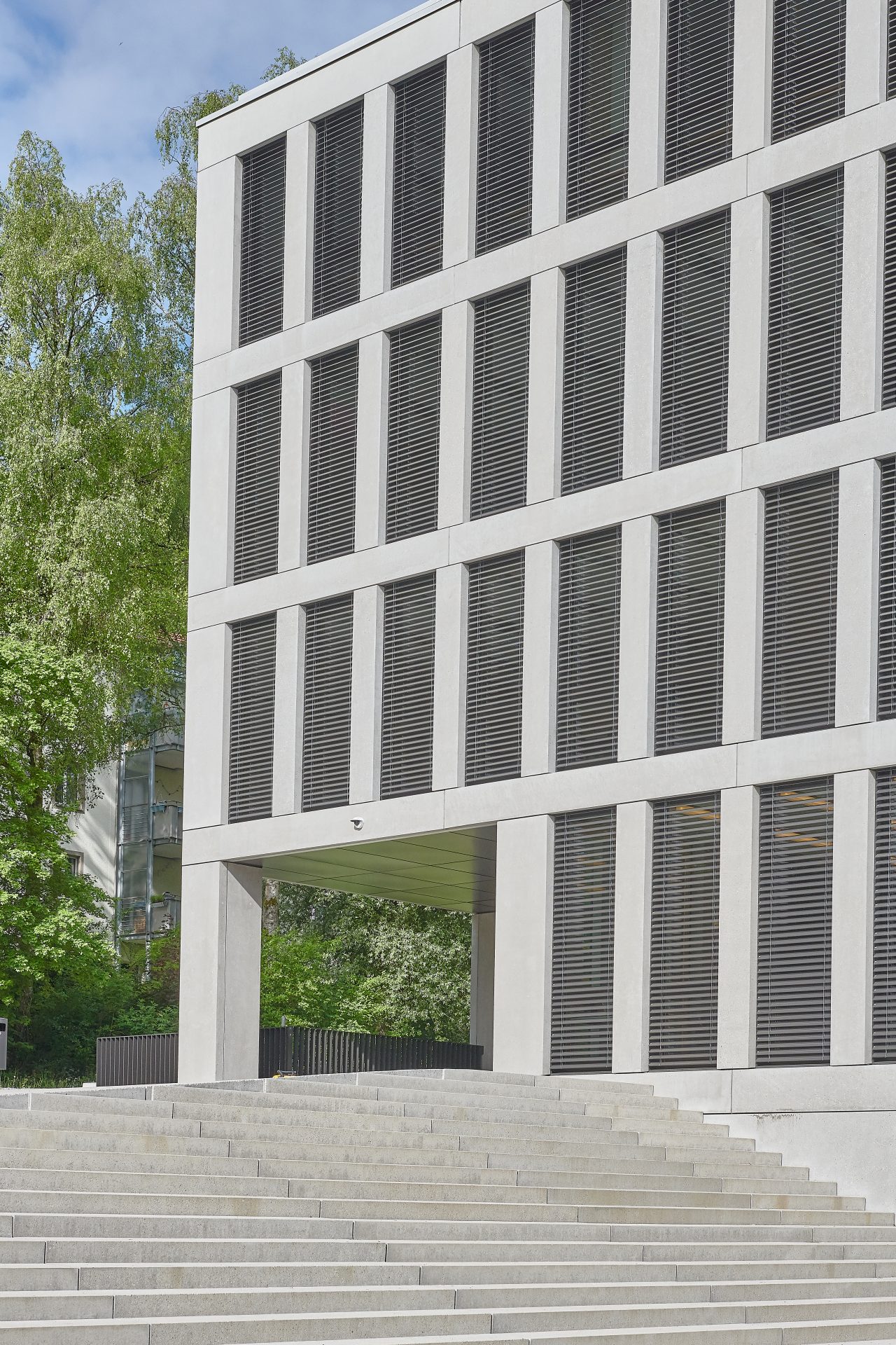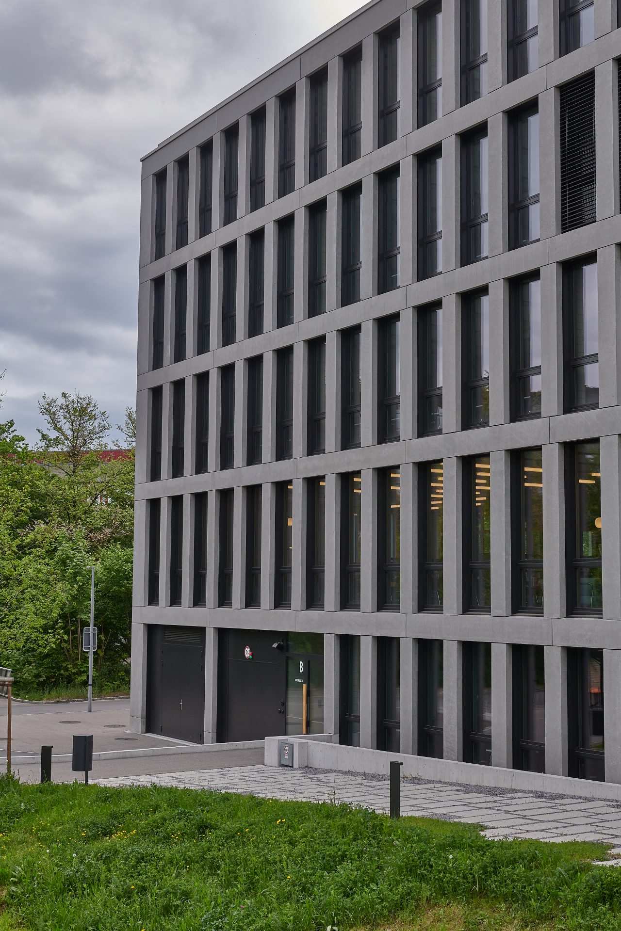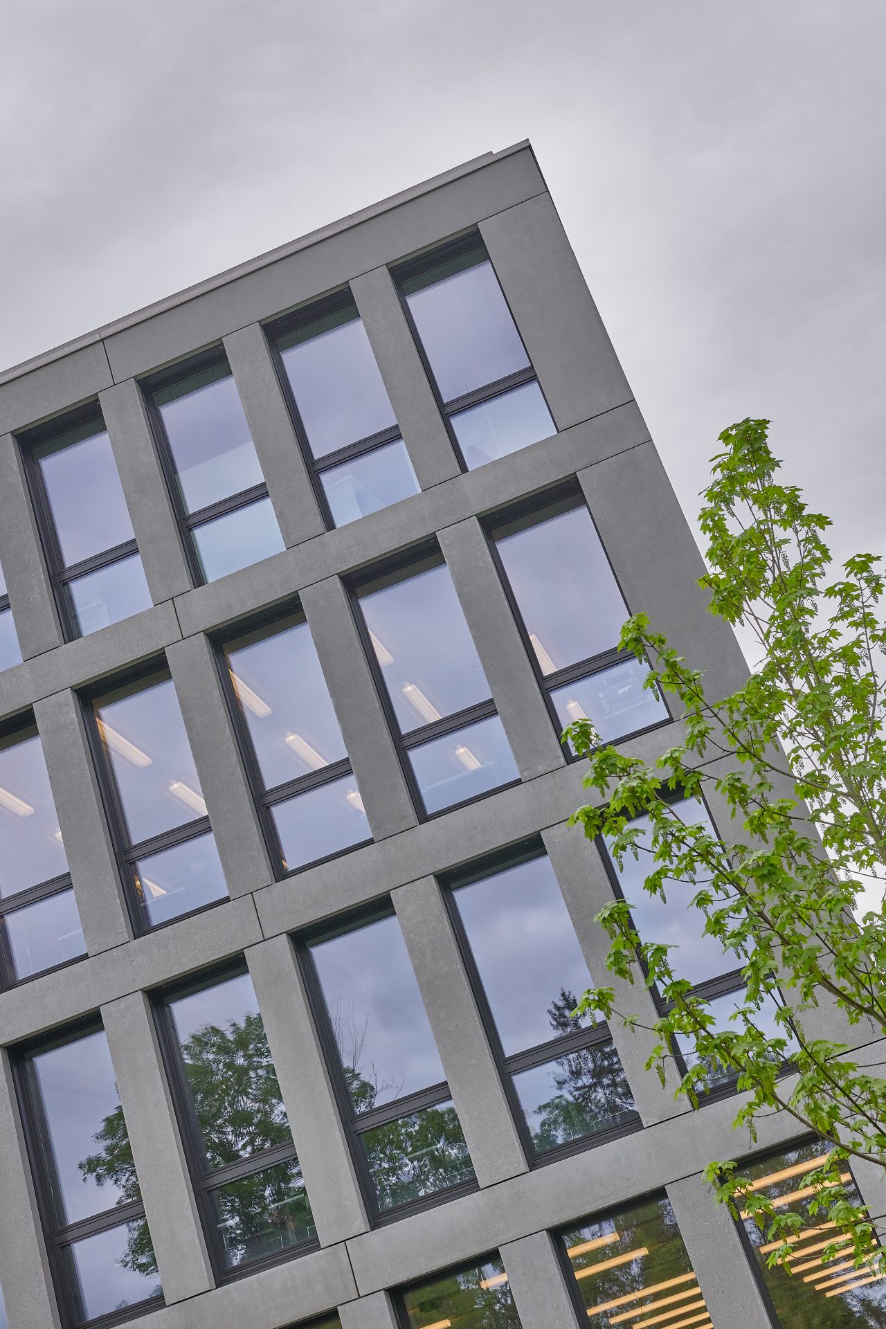 Wir als Betonelementhersteller durften die gesamte Fassade des Erweiterungsbaues planen, herstellen und montieren. Die rund 850 mehrheitlich vorgehängten Fassadenelemente sind in unserer Betonsorte 555 hergestellt und teilweise sandgestrahlt. Die Elemente wurden nach der Montage gereinigt, tiefenhydrophobiert und imprägniert. Durch die Hydrophobierung erhält der Beton eine Art „Schutzmantel“ mit wasserabweisender Wirkung. Dies hat keinen Einfluss auf den ästhetischen Charakter der Betonoberfläche. Der Schmutz setzt sich dadurch deutlich weniger ab und die Elemente bleiben länger „sauber“. Die Imprägnierung kann nach einigen Jahren auch erneuert werden, wenn die Oberfläche Verschmutzungen aufweisen sollte.