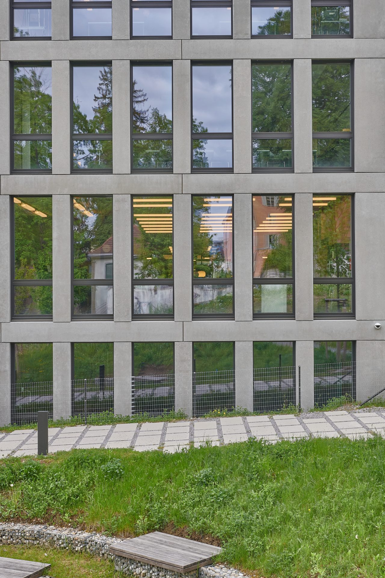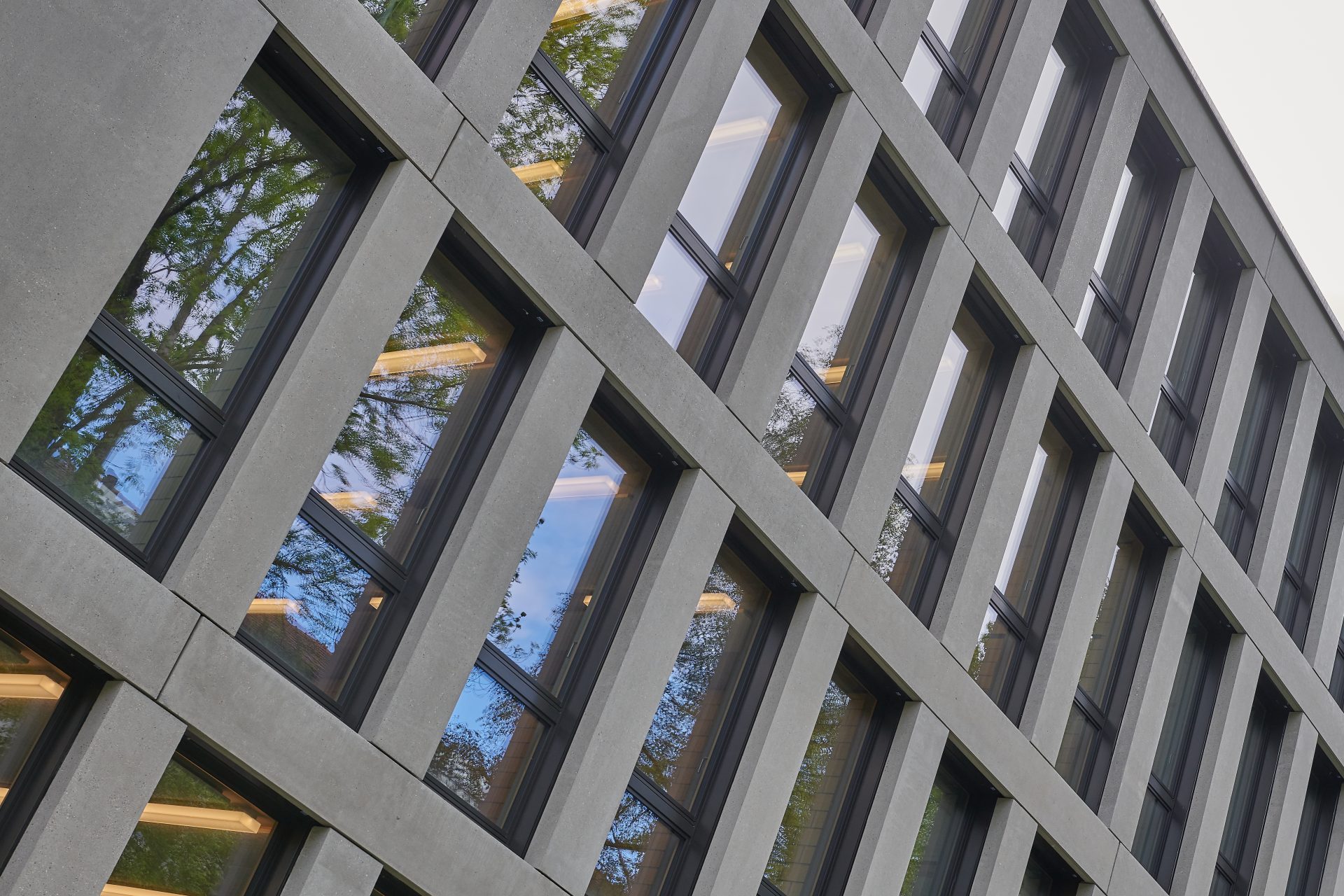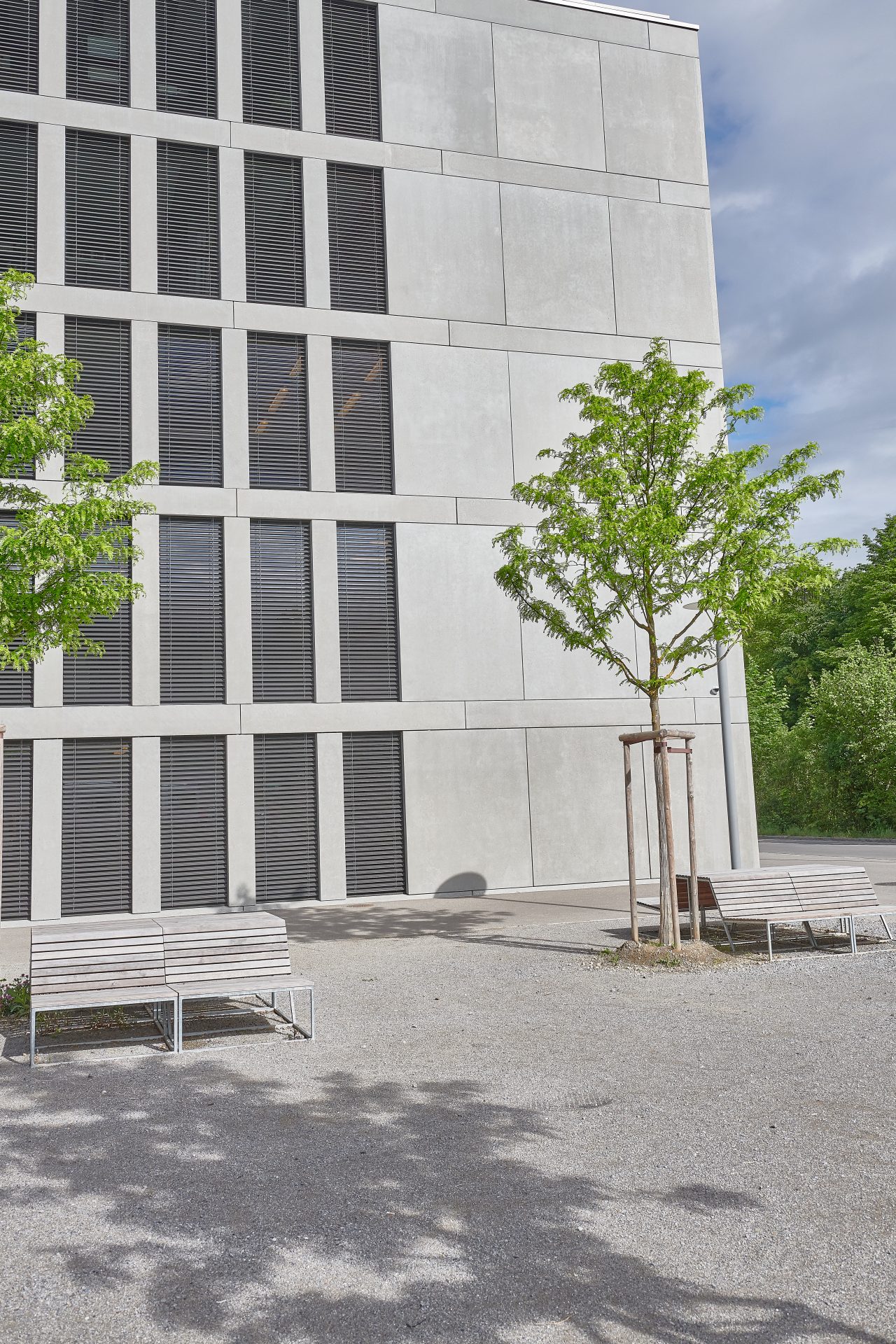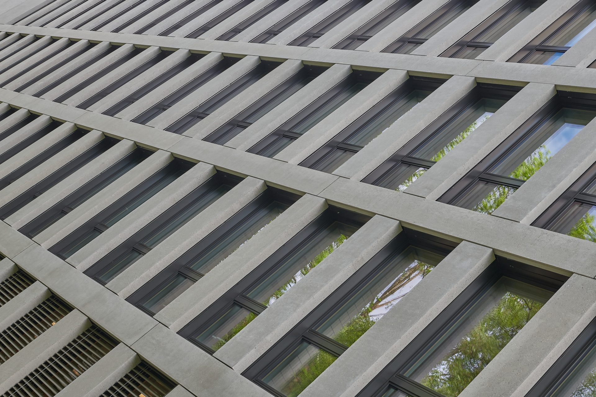Wir als Betonelementhersteller durften die gesamte Fassade des Erweiterungsbaues planen, herstellen und montieren. Die rund 850 mehrheitlich vorgehängten Fassadenelemente sind in unserer Betonsorte 555 hergestellt und teilweise sandgestrahlt. Die Elemente wurden nach der Montage gereinigt, tiefenhydrophobiert und imprägniert. Durch die Hydrophobierung erhält der Beton eine Art „Schutzmantel“ mit wasserabweisender Wirkung. Dies hat keinen Einfluss auf den ästhetischen Charakter der Betonoberfläche. Der Schmutz setzt sich dadurch deutlich weniger ab und die Elemente bleiben länger „sauber“. Die Imprägnierung kann nach einigen Jahren auch erneuert werden, wenn die Oberfläche Verschmutzungen aufweisen sollte.
