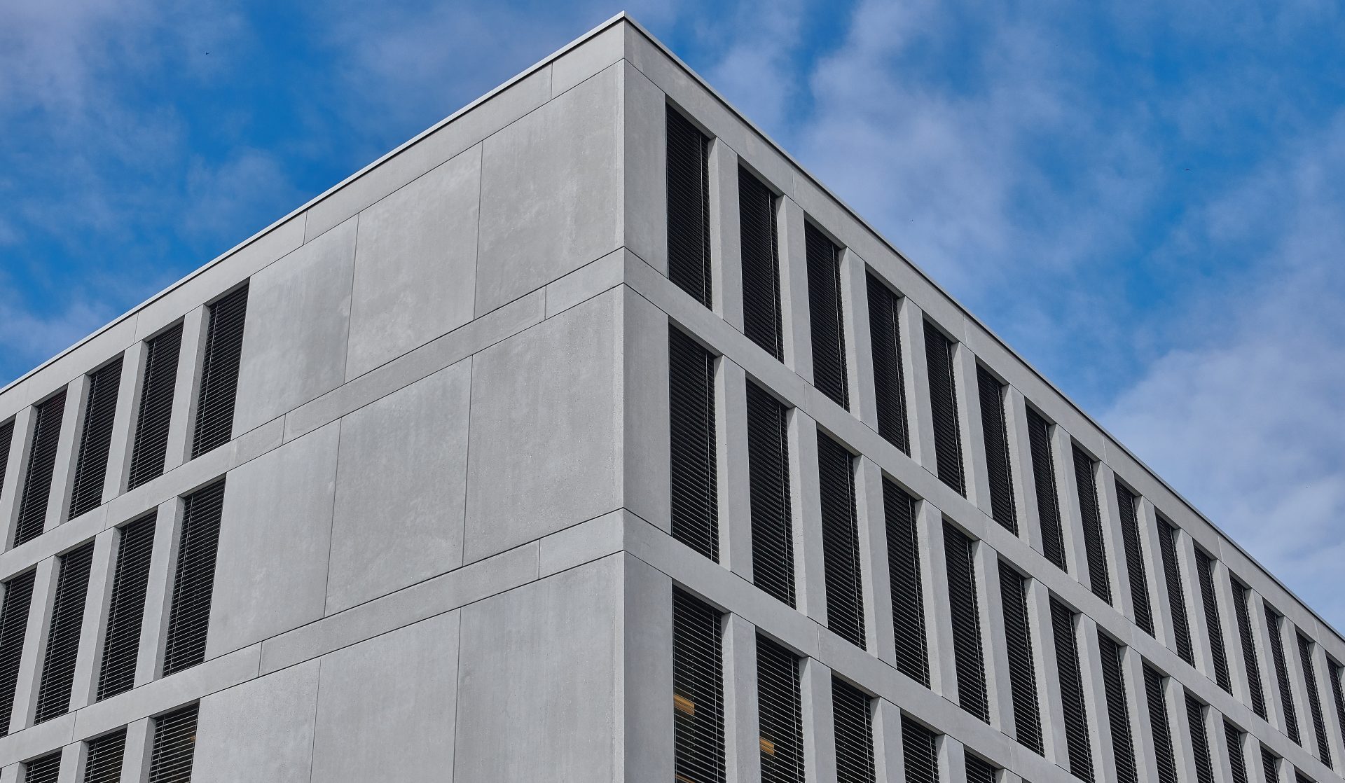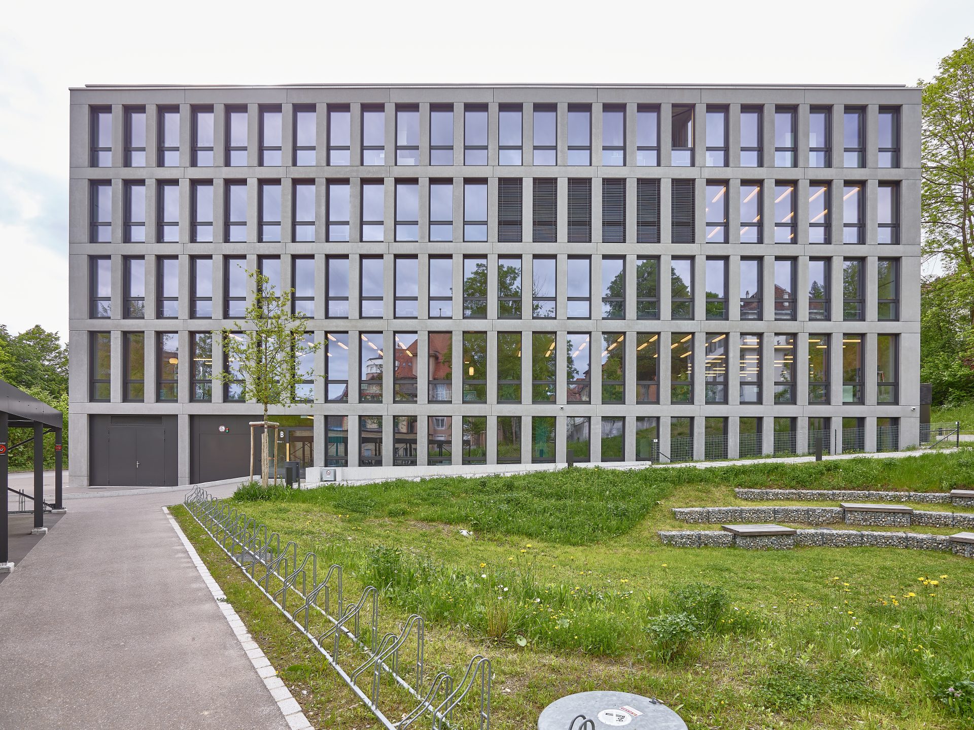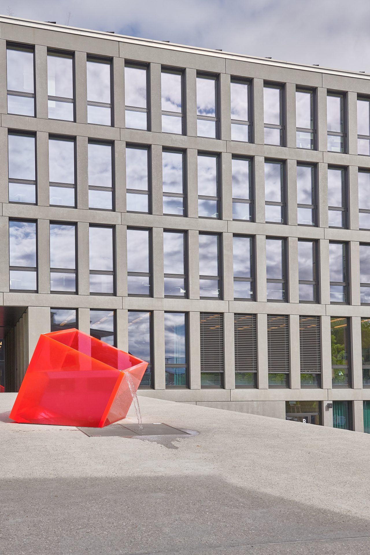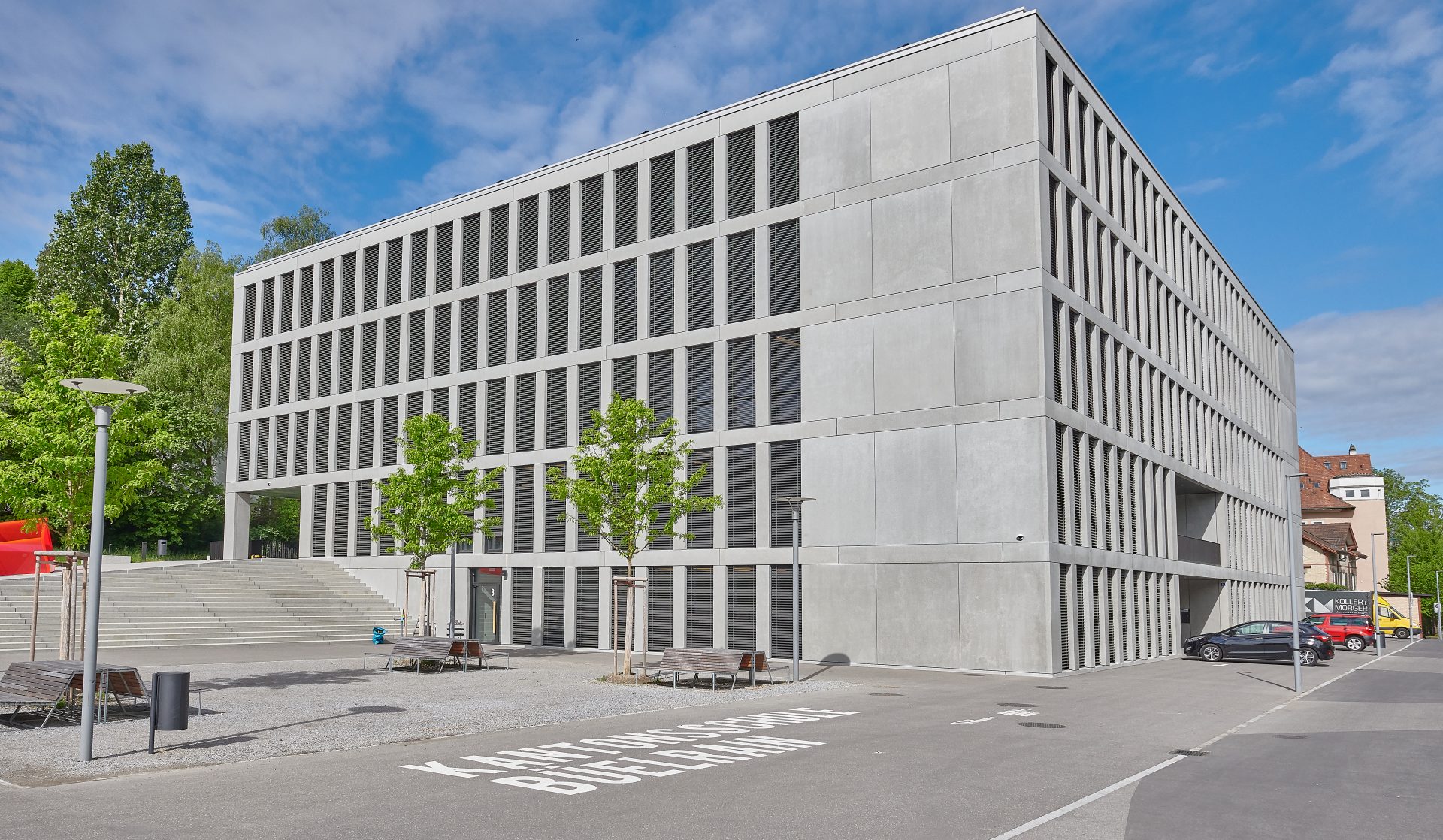 Wir als Betonelementhersteller durften die gesamte Fassade des Erweiterungsbaues planen, herstellen und montieren. Die rund 850 mehrheitlich vorgehängten Fassadenelemente sind in unserer Betonsorte 555 hergestellt und teilweise sandgestrahlt. Die Elemente wurden nach der Montage gereinigt, tiefenhydrophobiert und imprägniert. Durch die Hydrophobierung erhält der Beton eine Art „Schutzmantel“ mit wasserabweisender Wirkung. Dies hat keinen Einfluss auf den ästhetischen Charakter der Betonoberfläche. Der Schmutz setzt sich dadurch deutlich weniger ab und die Elemente bleiben länger „sauber“. Die Imprägnierung kann nach einigen Jahren auch erneuert werden, wenn die Oberfläche Verschmutzungen aufweisen sollte.