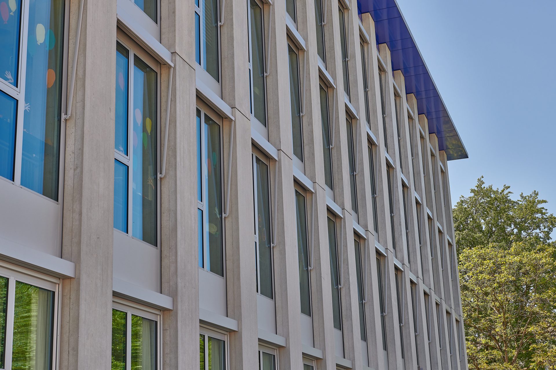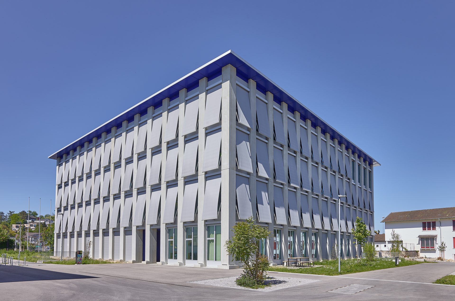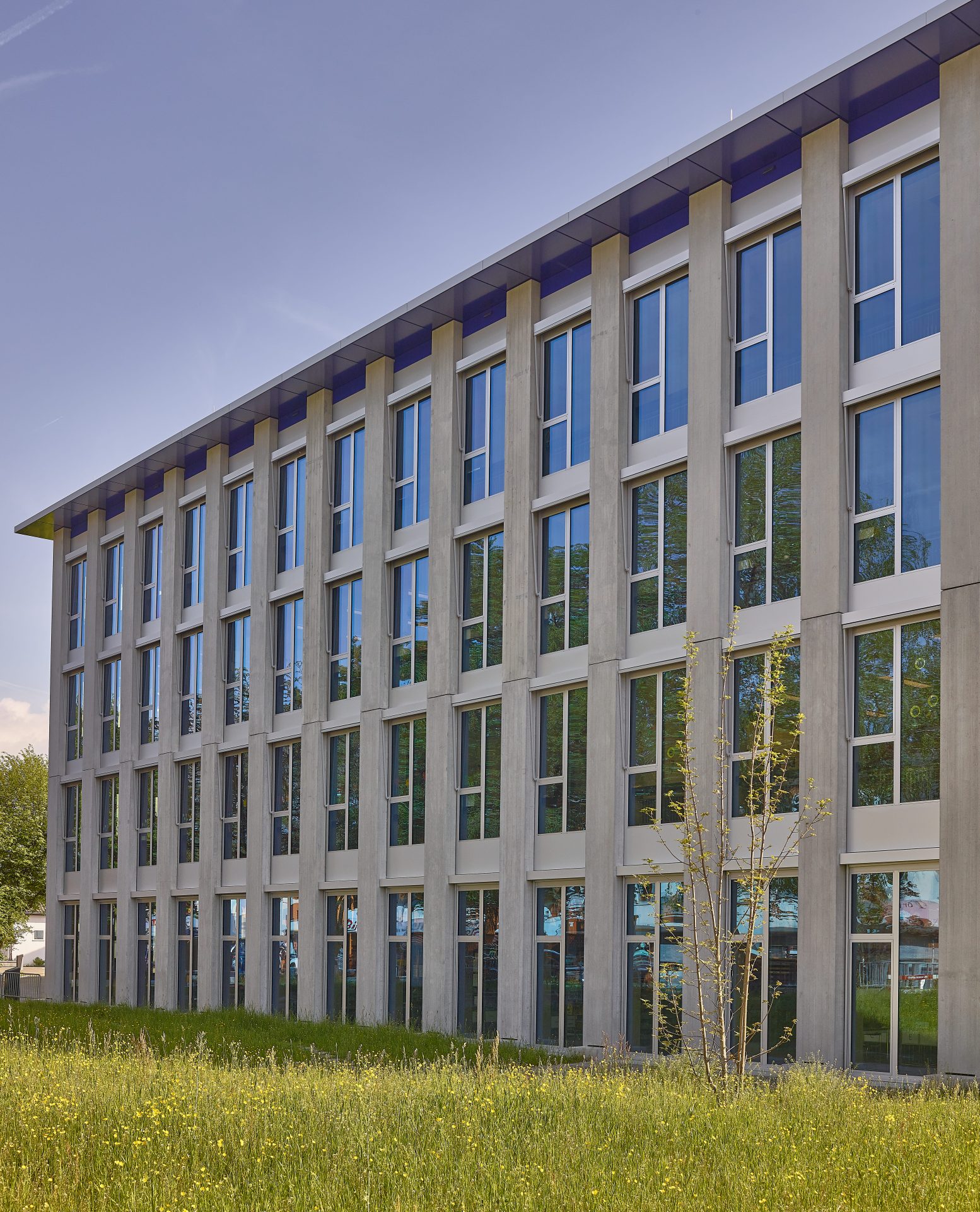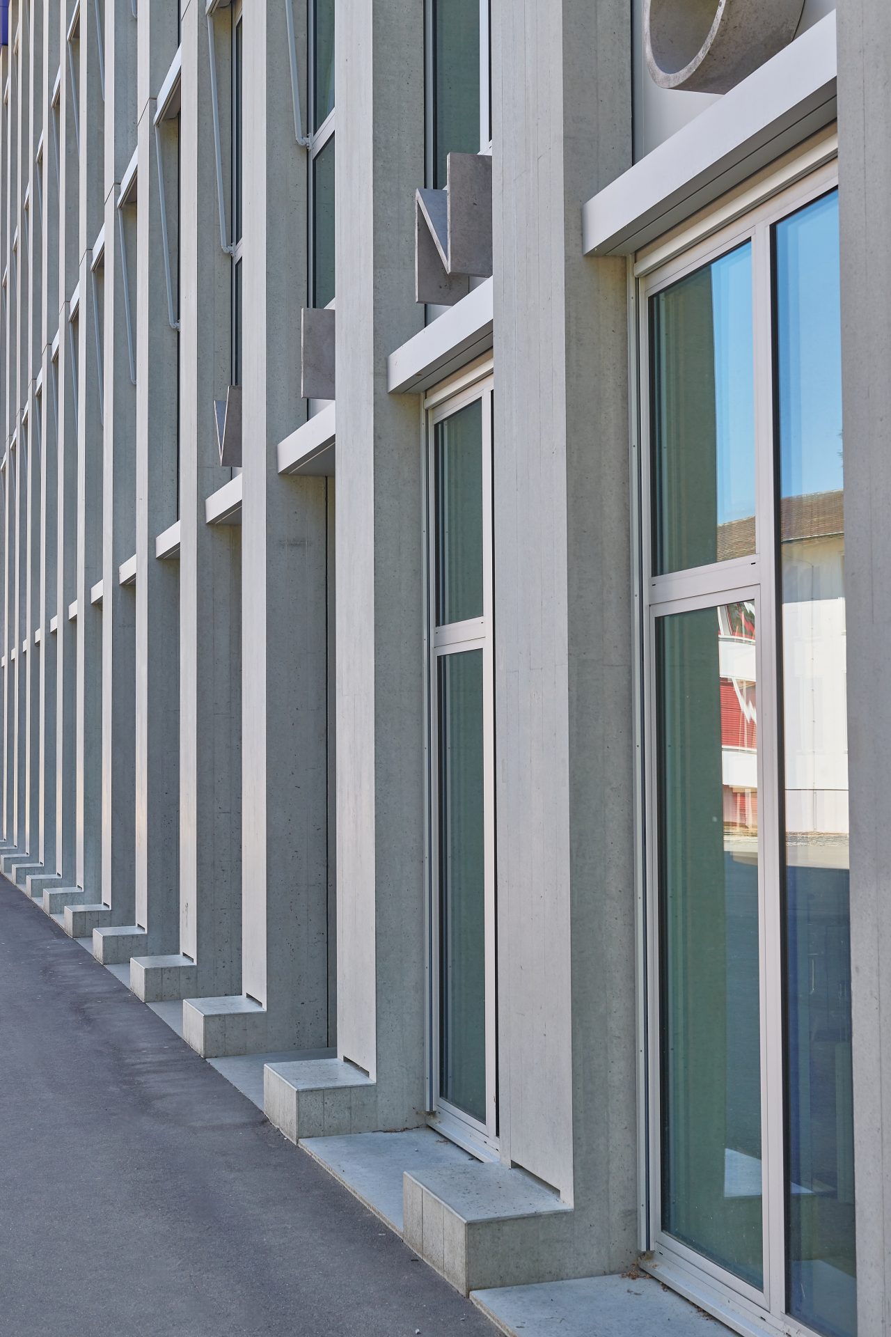 Die vorfabrizierten Betonelemente für die Fassade wurden in einem Grauton und mit einer Bretterstruktur erstellt. Dazu im geregelten Raster angeordnet, geben sie dem Gebäude den gewünschten Charakter.