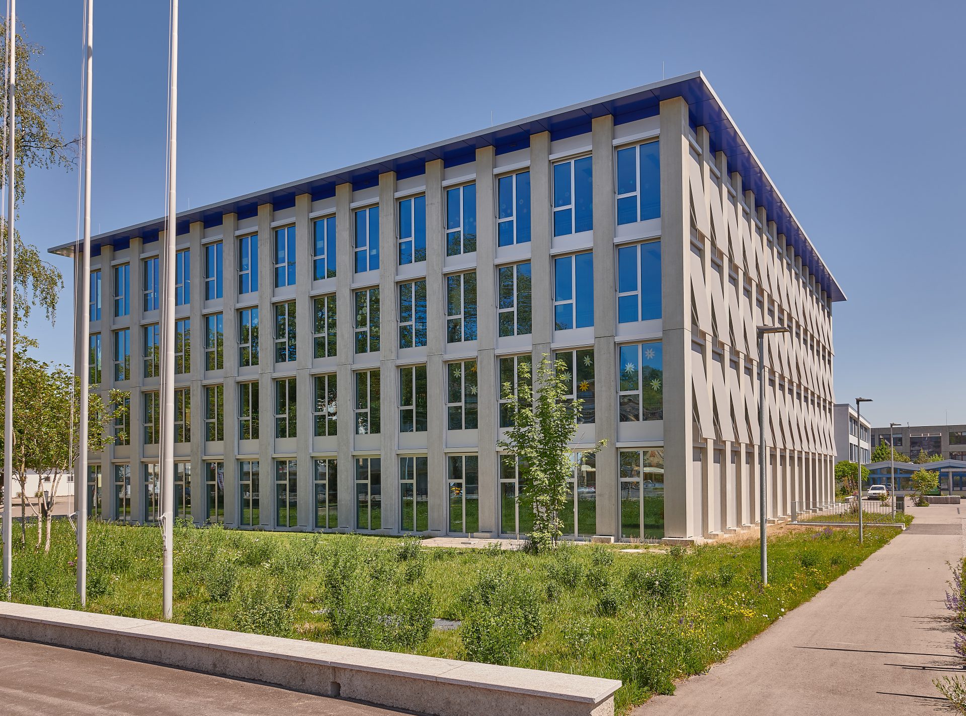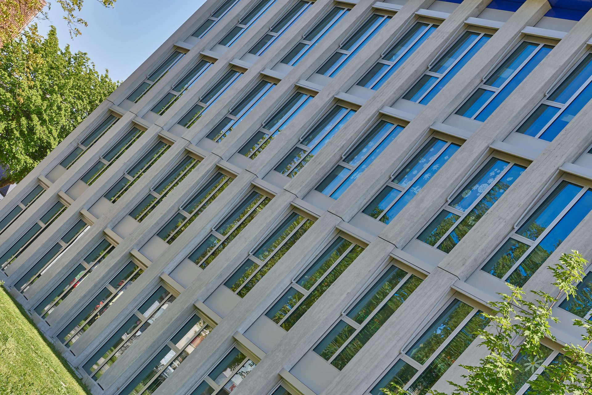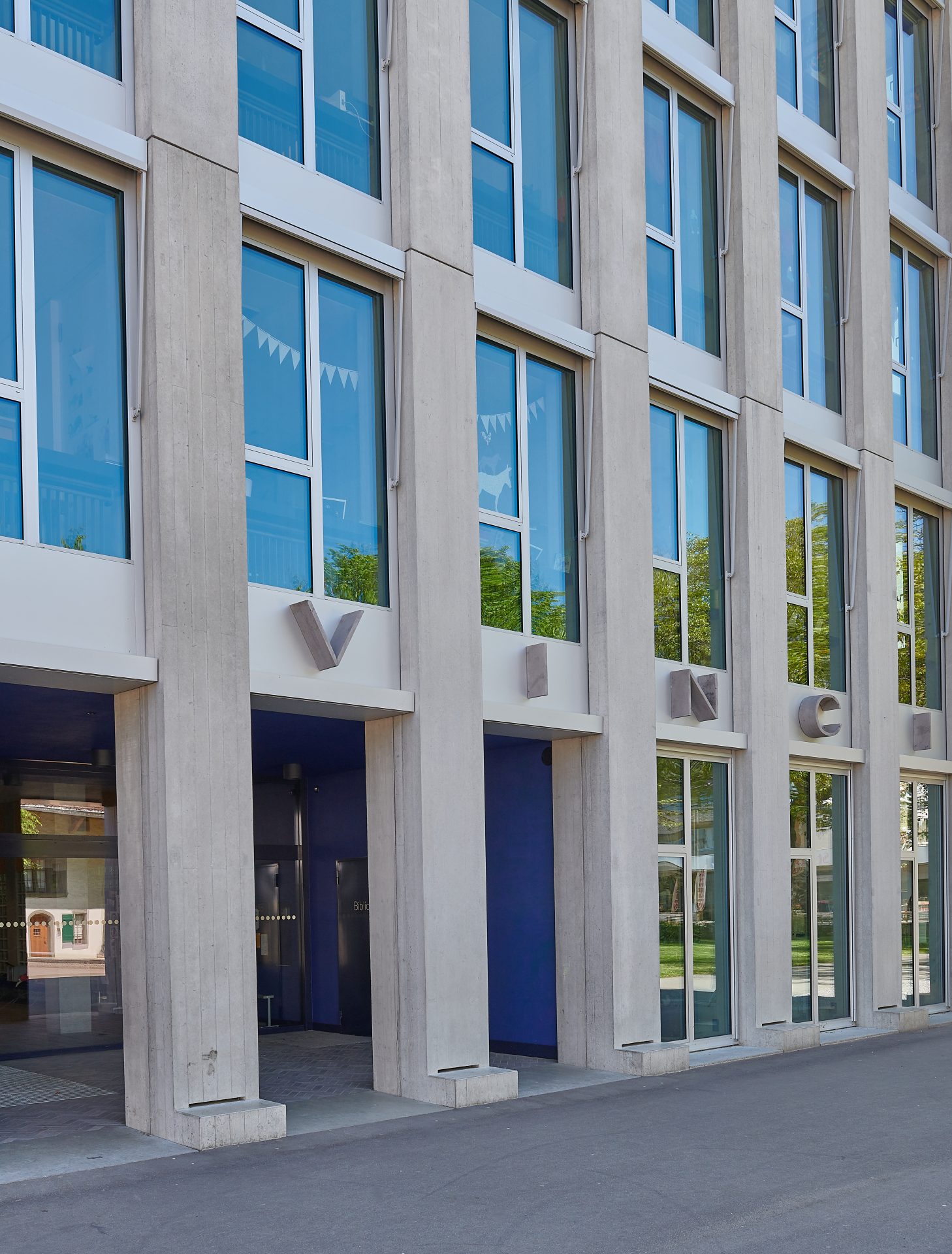 Die vorfabrizierten Betonelemente für die Fassade wurden in einem Grauton und mit einer Bretterstruktur erstellt. Dazu im geregelten Raster angeordnet, geben sie dem Gebäude den gewünschten Charakter.