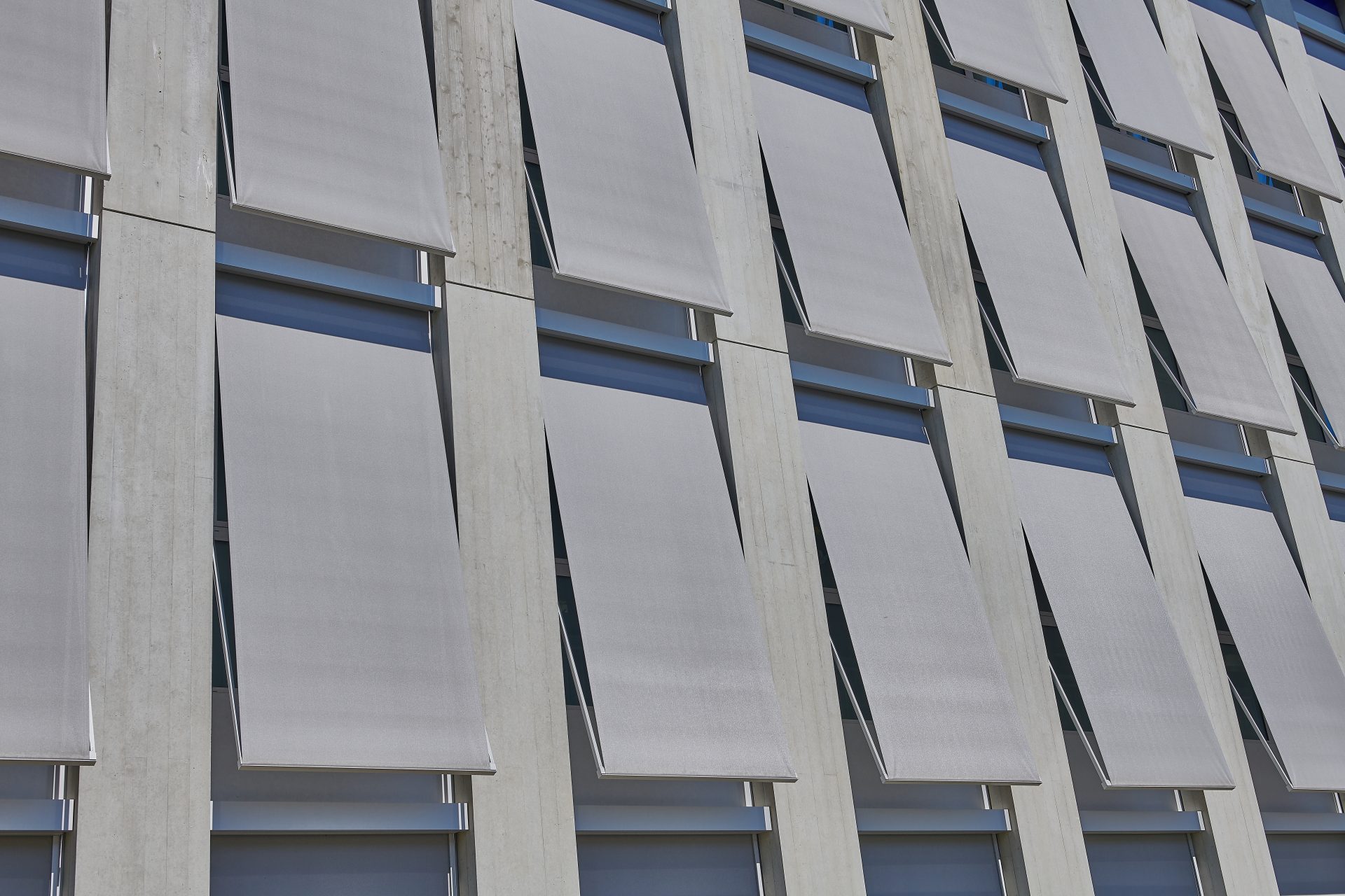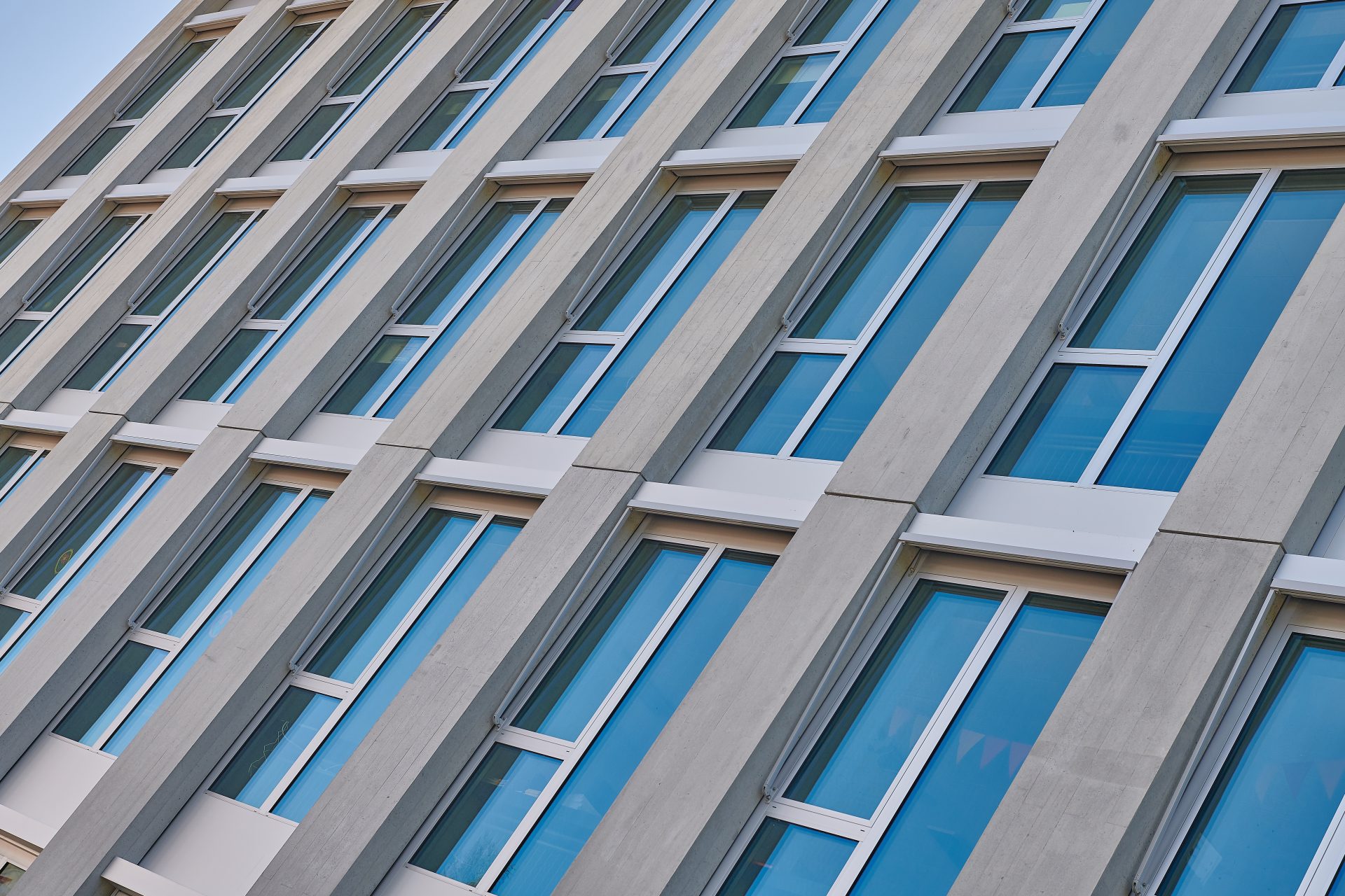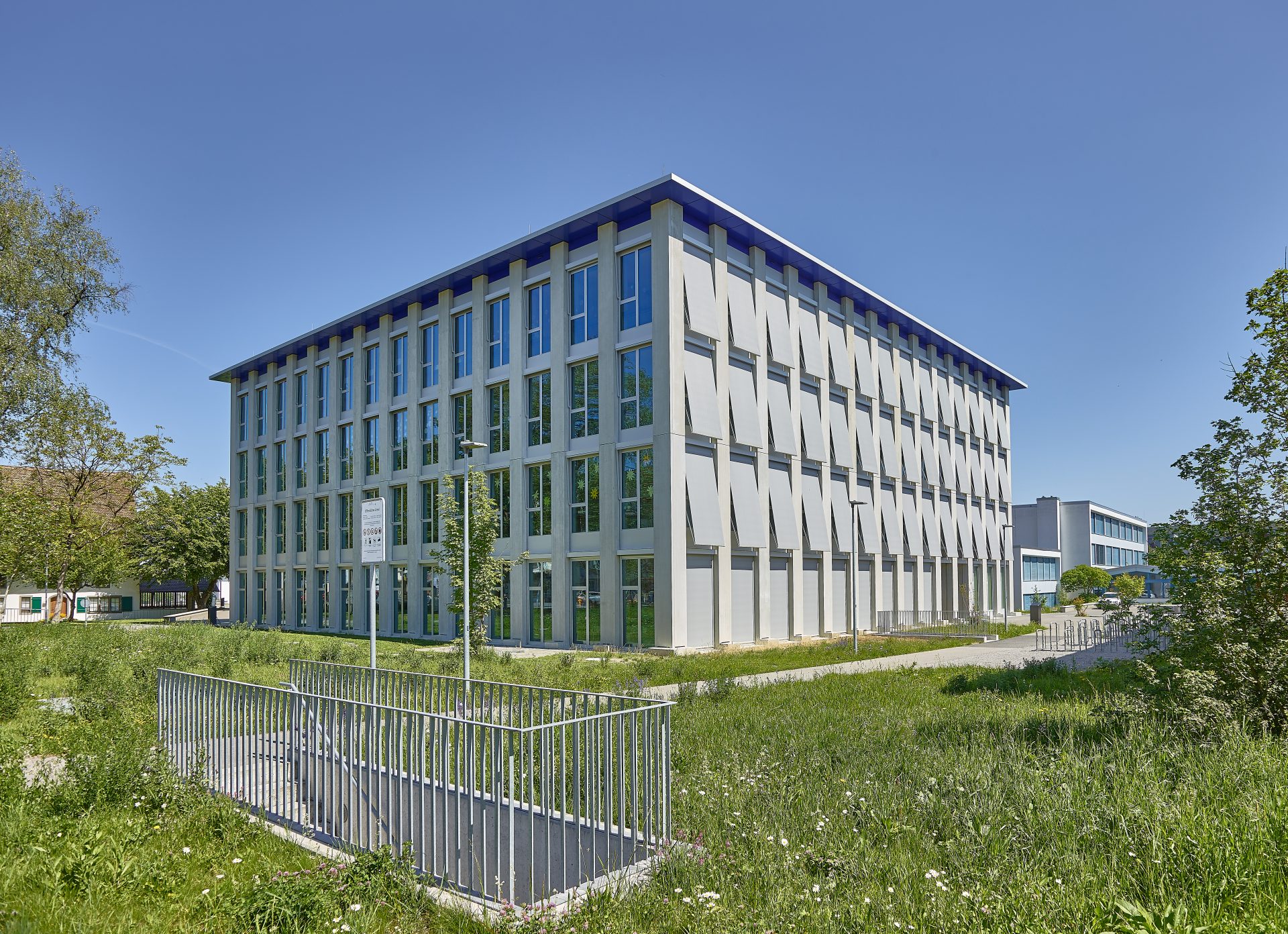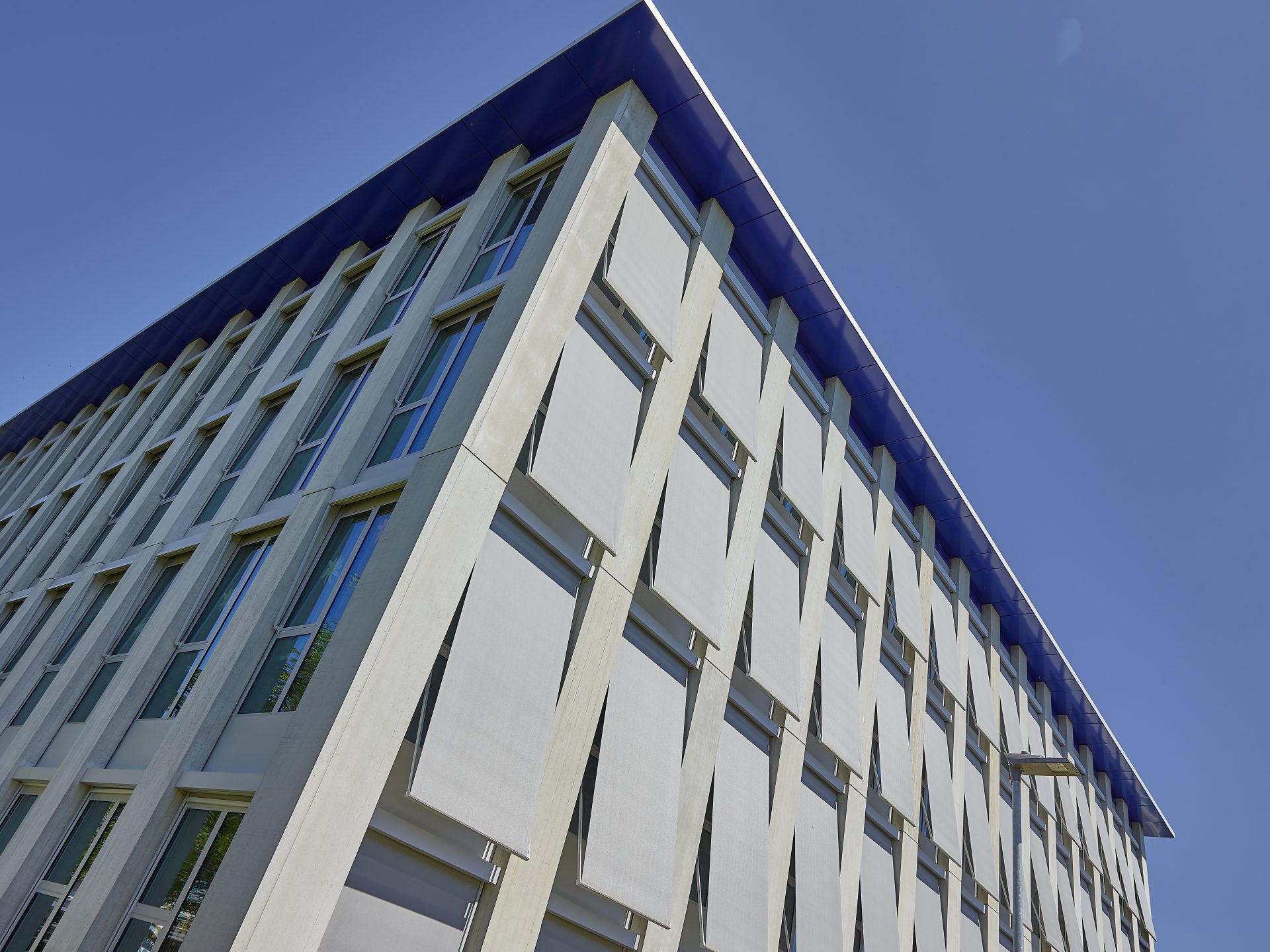 Die vorfabrizierten Betonelemente für die Fassade wurden in einem Grauton und mit einer Bretterstruktur erstellt. Dazu im geregelten Raster angeordnet, geben sie dem Gebäude den gewünschten Charakter.