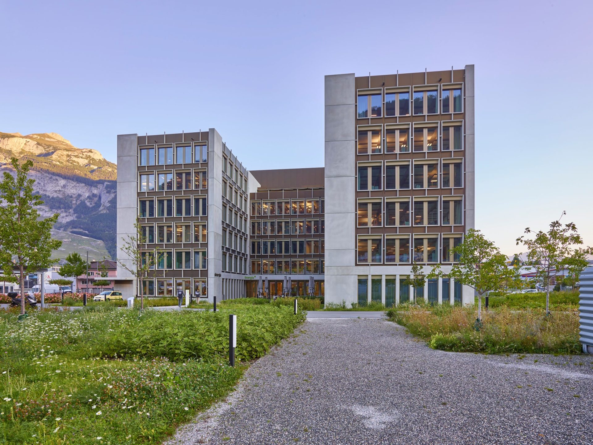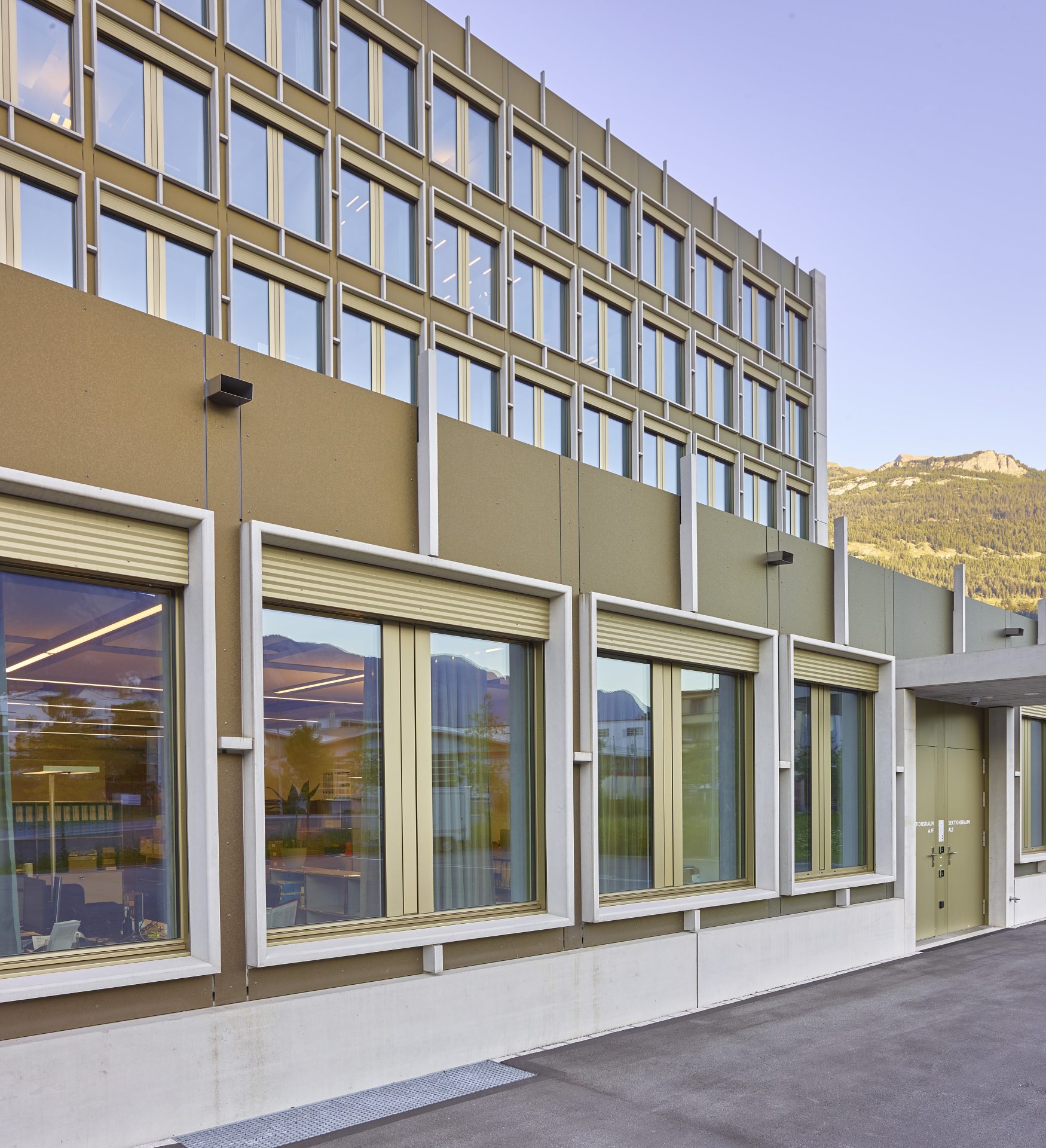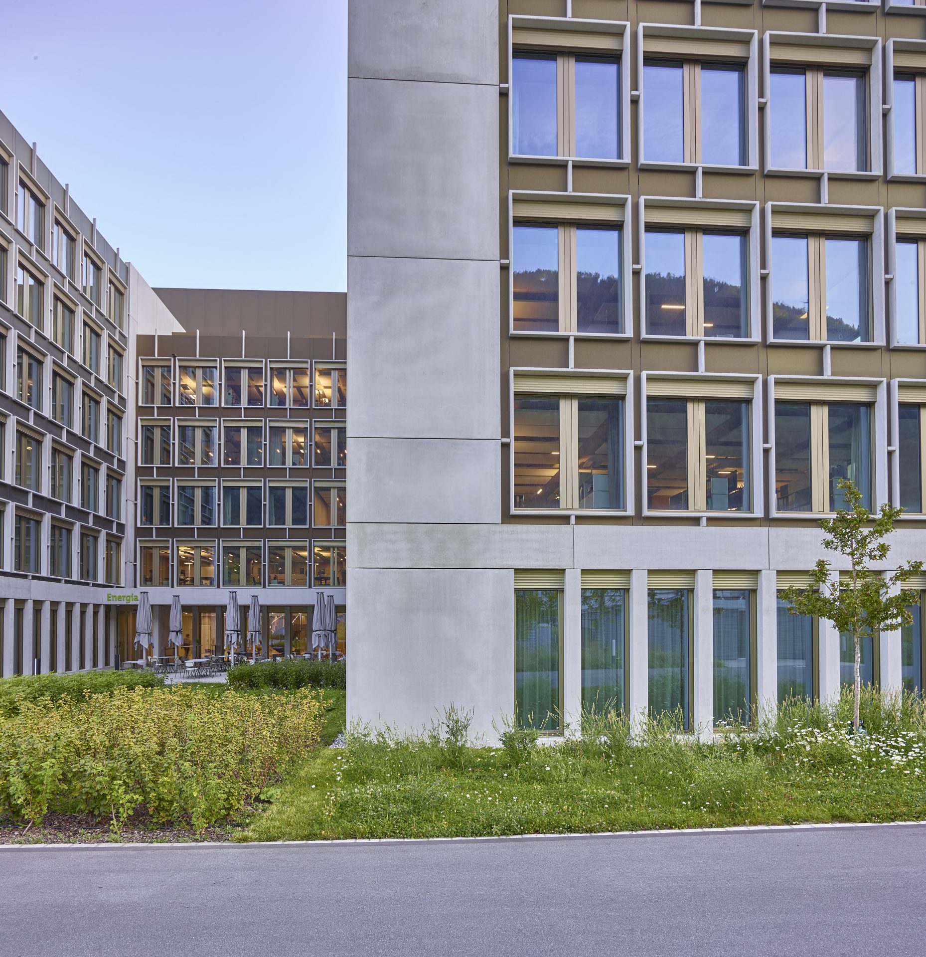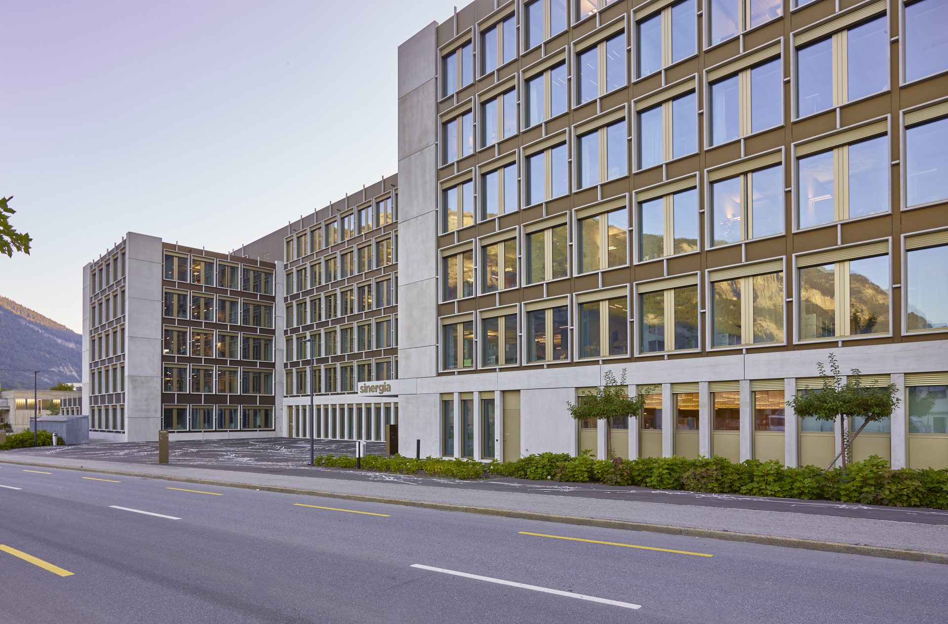 Ein nicht alltäglicher Auftrag waren die rund 1120 Rahmen- und Fassadenelemente für das neue Verwaltungsgebäude „Sinergia“ in Chur. Die Architekten D. Jüngling und A. Hagmann aus Chur planten eine Fassade mit filigranen, vorgehängten und schalungsglatten Betonelementrahmen. Zwischen den Betonrahmen wurden Alucobond-Platten befestigt. Die filigranen Rahmenelemente sind mit massenhydrophobiertem Beton hergestellt. Eine Herausforderung waren die nur 8cm dicken Bauteile, was eine übliche Betonüberdeckung für handelsüblichen Armierungsstahl aufgrund der Rostbildung unmöglich machte. Deshalb mussten die Rahmenelemente mit rostfreiem Stahl (Chromstahlarmierung) erstellt werden. Eine zusätzliche Schwierigkeit bestand im Transport der Rahmenelemente. Die sehr dünnen und filigranen Elemente waren fast 4 m hoch und mussten mit speziellen Böcken stehend transportiert werden.
