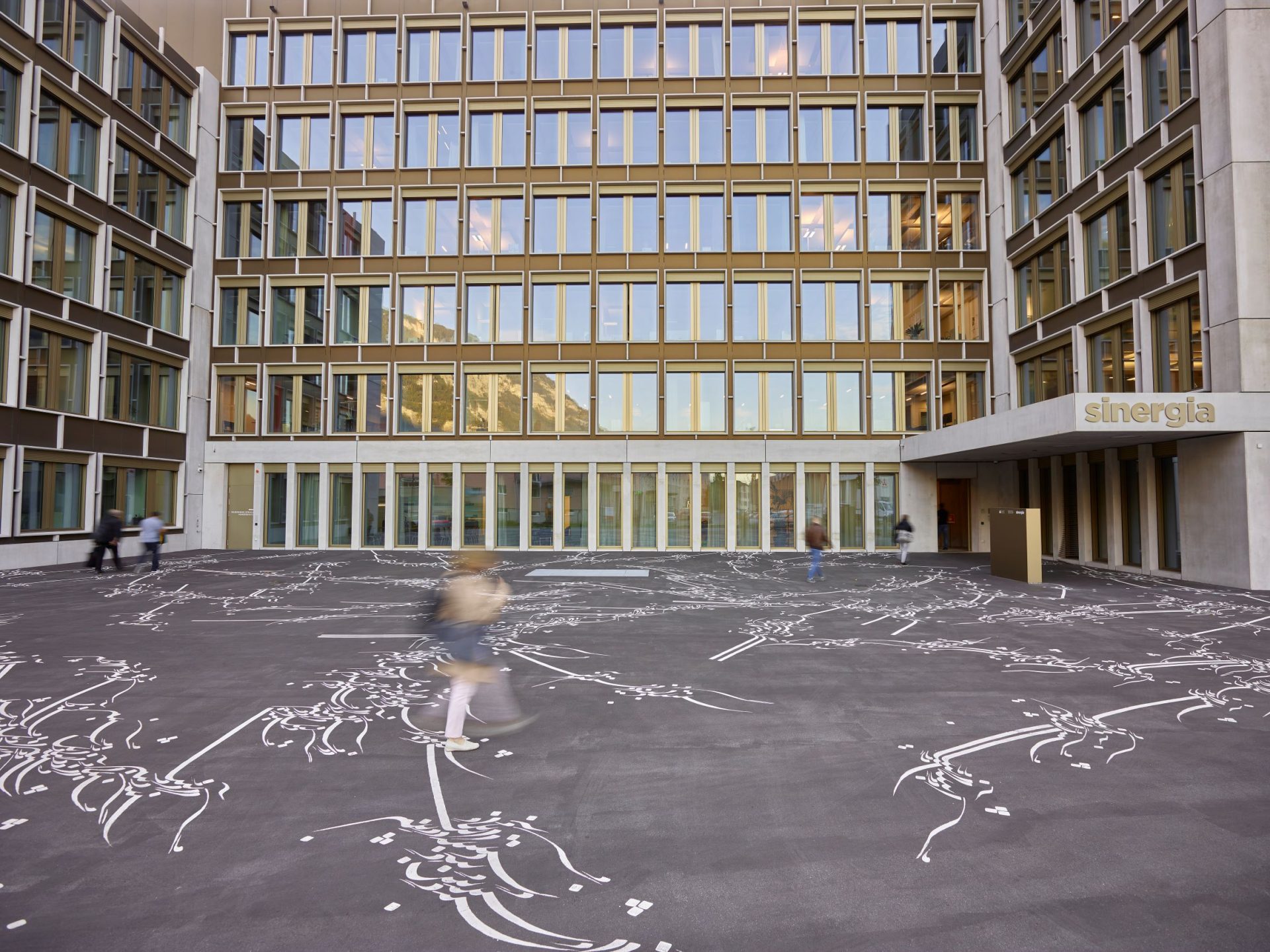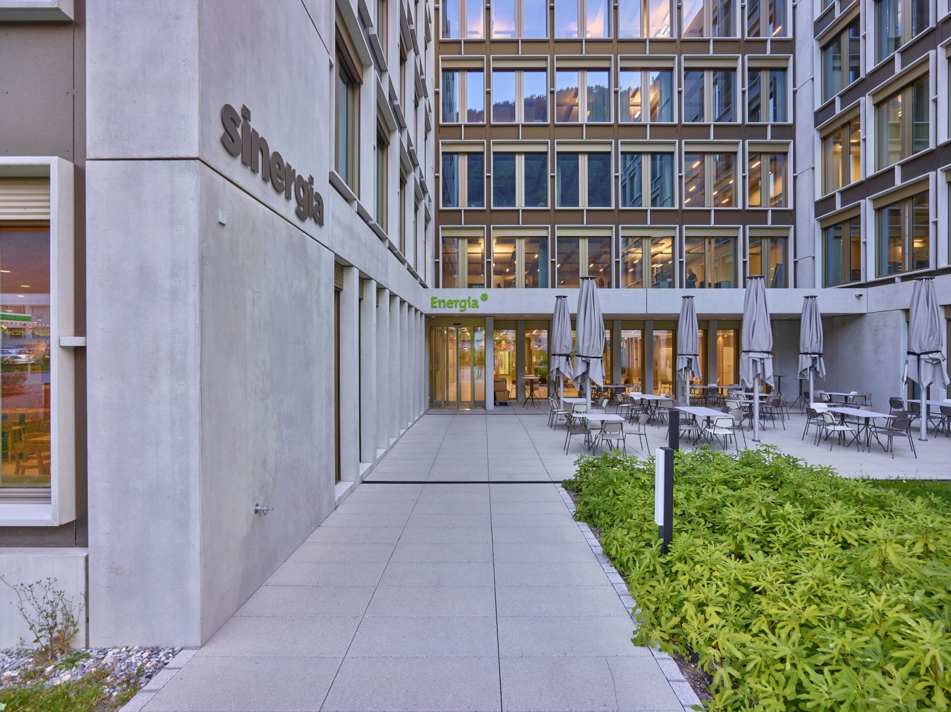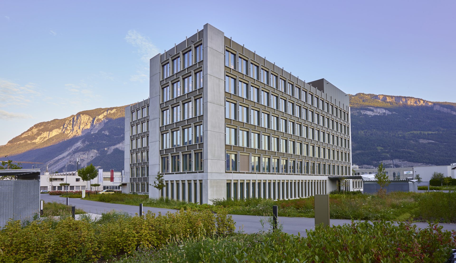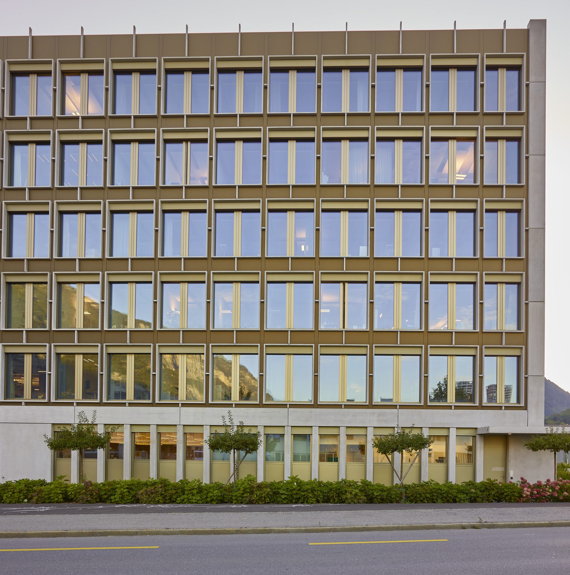 Ein nicht alltäglicher Auftrag waren die rund 1120 Rahmen- und Fassadenelemente für das neue Verwaltungsgebäude „Sinergia“ in Chur. Die Architekten D. Jüngling und A. Hagmann aus Chur planten eine Fassade mit filigranen, vorgehängten und schalungsglatten Betonelementrahmen. Zwischen den Betonrahmen wurden Alucobond-Platten befestigt. Die filigranen Rahmenelemente sind mit massenhydrophobiertem Beton hergestellt. Eine Herausforderung waren die nur 8cm dicken Bauteile, was eine übliche Betonüberdeckung für handelsüblichen Armierungsstahl aufgrund der Rostbildung unmöglich machte. Deshalb mussten die Rahmenelemente mit rostfreiem Stahl (Chromstahlarmierung) erstellt werden. Eine zusätzliche Schwierigkeit bestand im Transport der Rahmenelemente. Die sehr dünnen und filigranen Elemente waren fast 4 m hoch und mussten mit speziellen Böcken stehend transportiert werden.