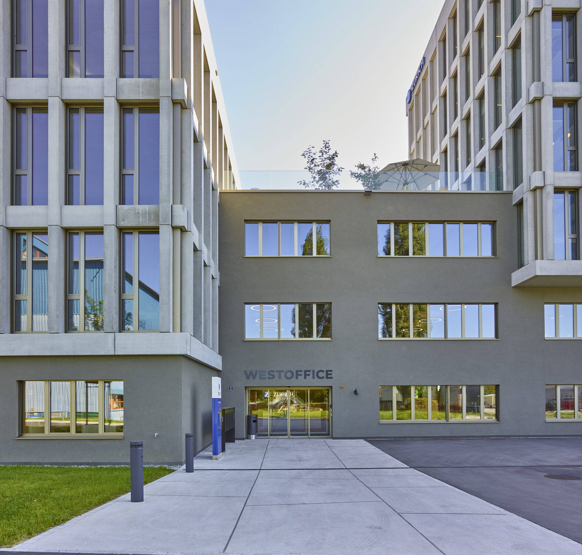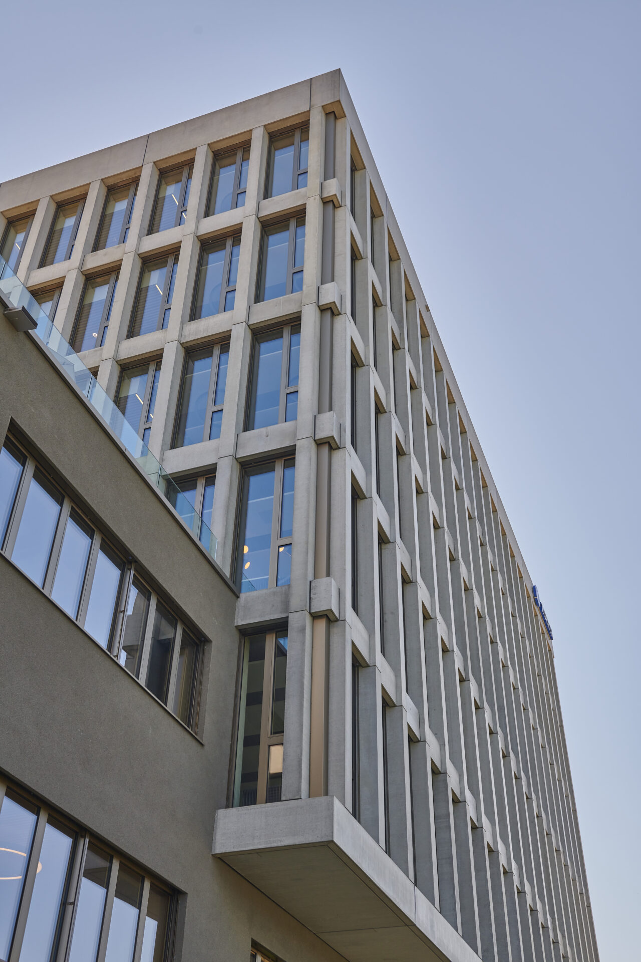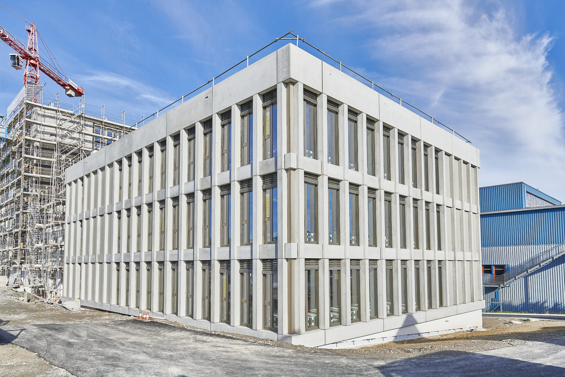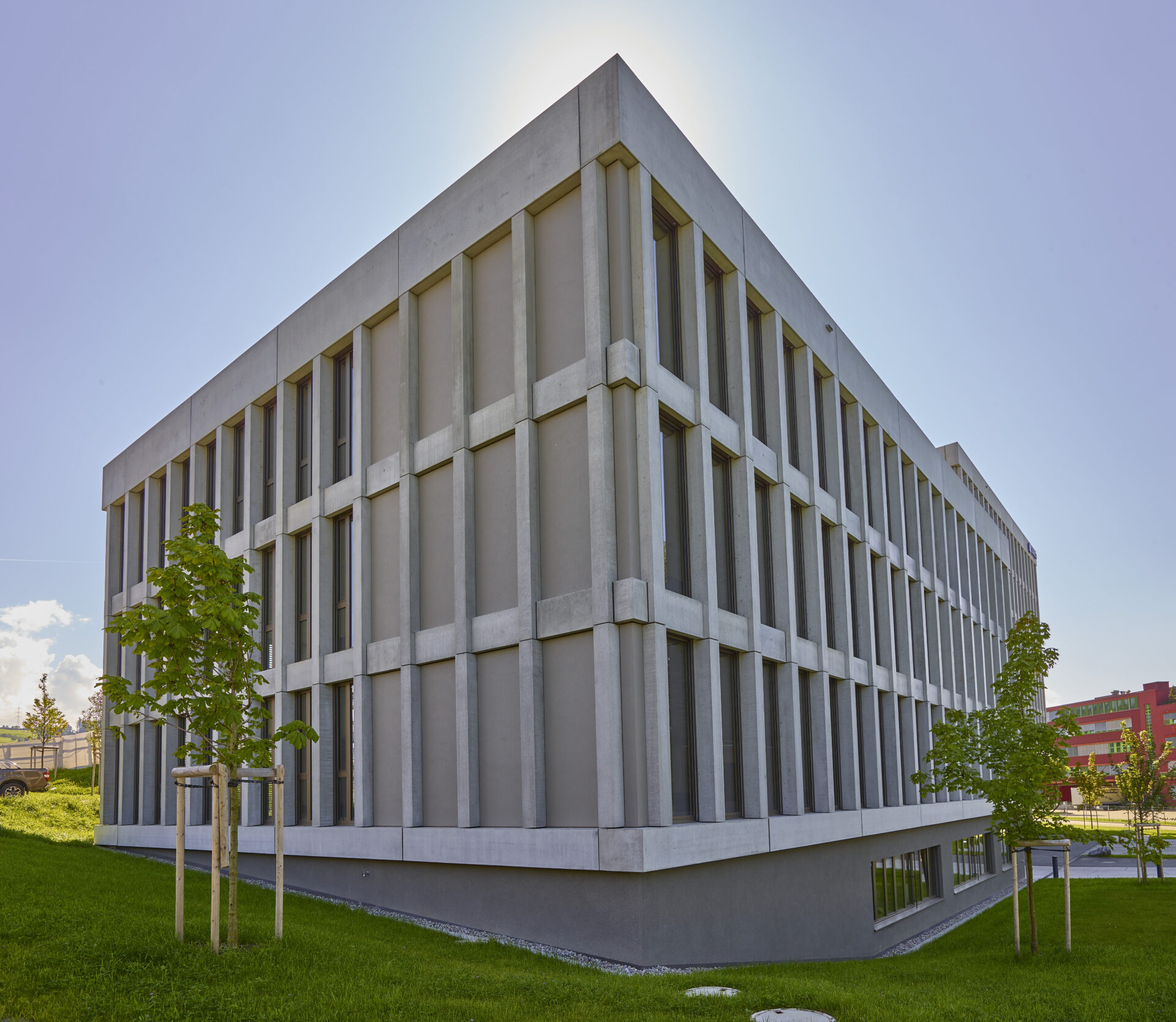 In St. Gallen entstand das neue Geschäftshaus „Westoffice“ – wie es der Name schon sagt – im Westen von St. Gallen. Die gesamte Fassade besteht aus vorgefertigten Betonelementen aus unserer Produktion. Das Betonrezept entspricht einem herkömmlichen „betongrau“ in glatter Struktur. Speziell an diesem Projekt war der Einsatz von Füllelementen aus Glasfaserbeton.