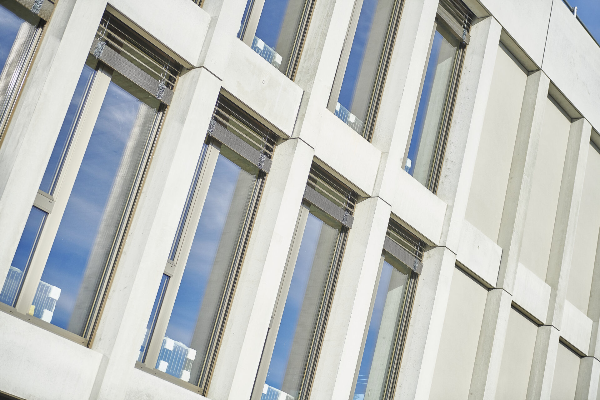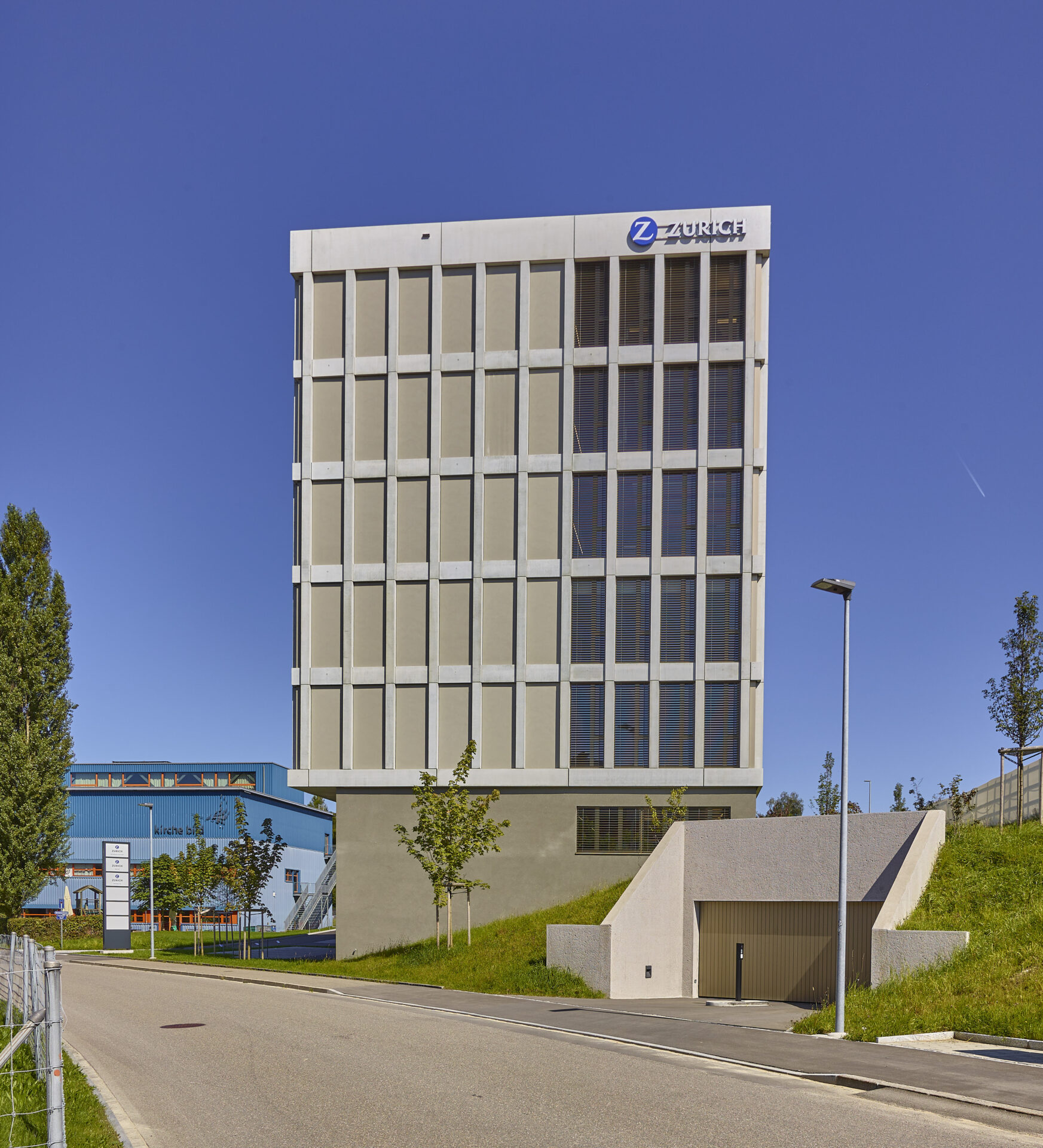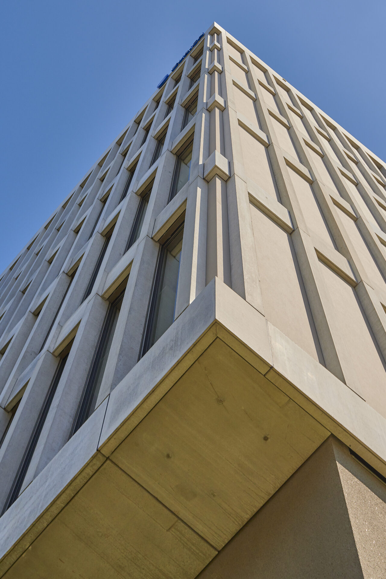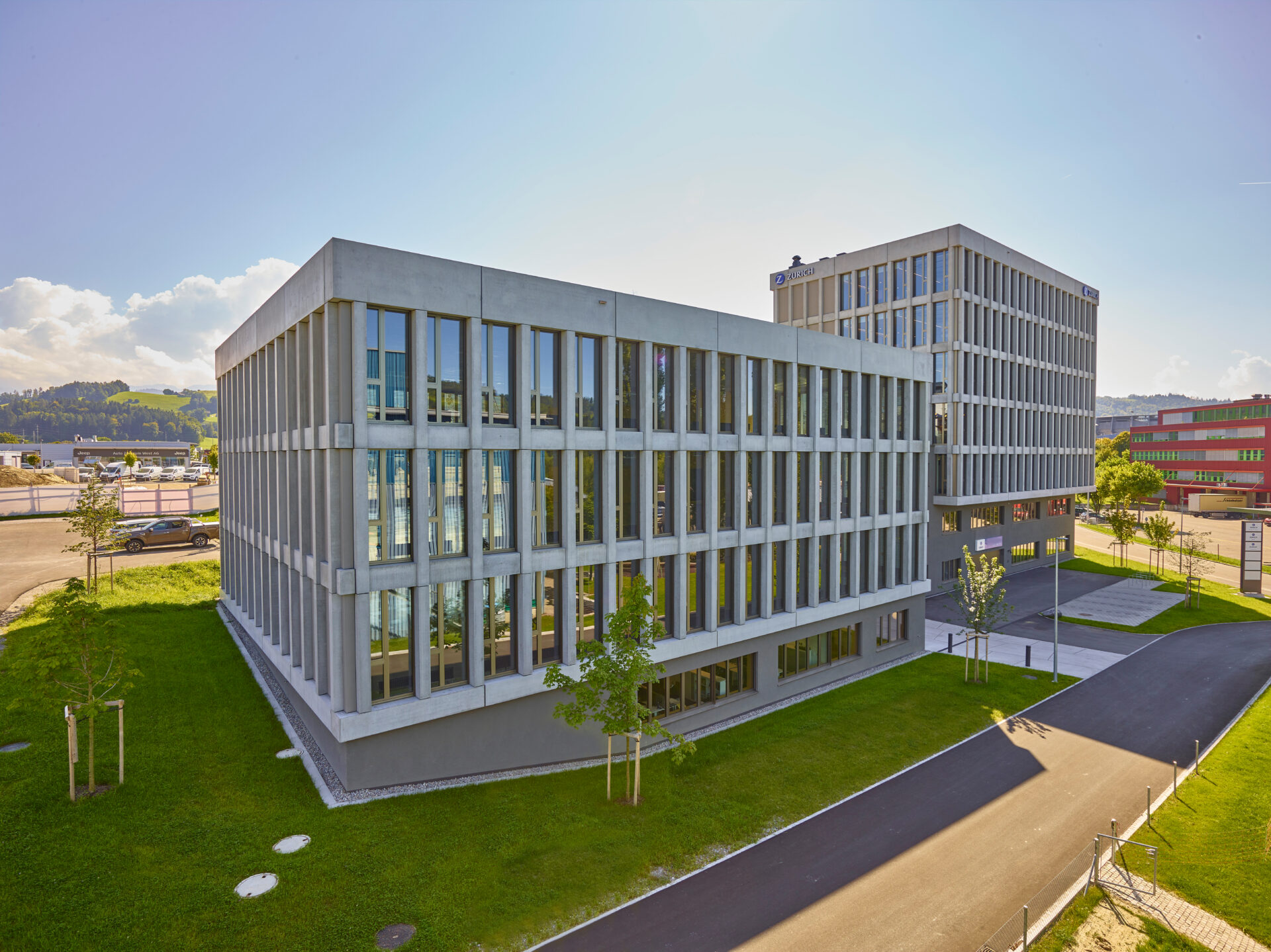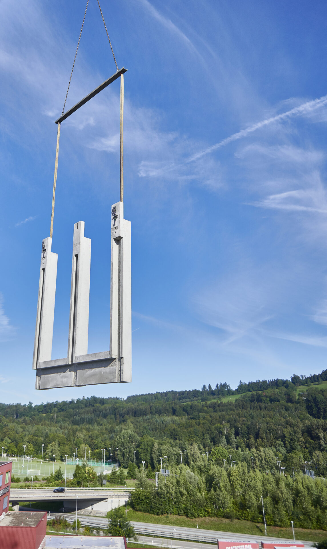 In St. Gallen entstand das neue Geschäftshaus „Westoffice“ – wie es der Name schon sagt – im Westen von St. Gallen. Die gesamte Fassade besteht aus vorgefertigten Betonelementen aus unserer Produktion. Das Betonrezept entspricht einem herkömmlichen „betongrau“ in glatter Struktur. Speziell an diesem Projekt war der Einsatz von Füllelementen aus Glasfaserbeton.